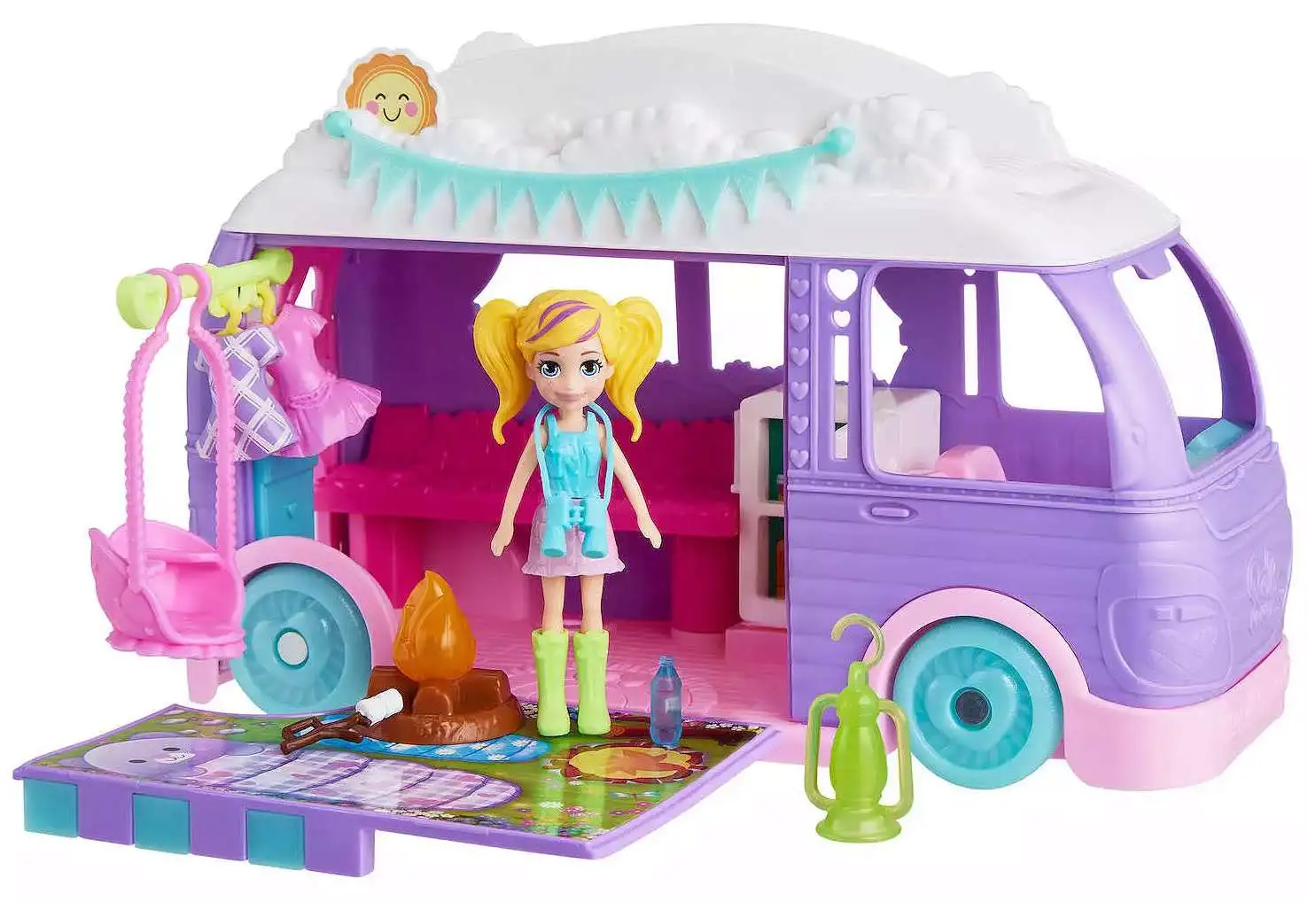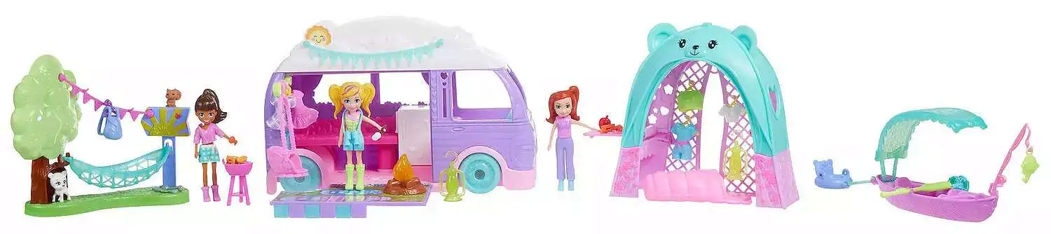 - This Polly Pocket Glamping Bundle offers a comprehensive outdoor adventure set with a camper van, tent, canoe, and pets, along with three dolls and over 45 accessories. Perfect for imaginative play, children can enjoy pretend camping, campfire nights, canoe trips, and more, fostering creativity and storytelling skills. The compact, portable design makes it easy to set up and pack away for on-the-go fun, encouraging social interaction and outdoor exploration in a colorful, engaging way. Whether recreating a weekend getaway or inventing new adventures, this bundle provides endless entertainment for young explorers.