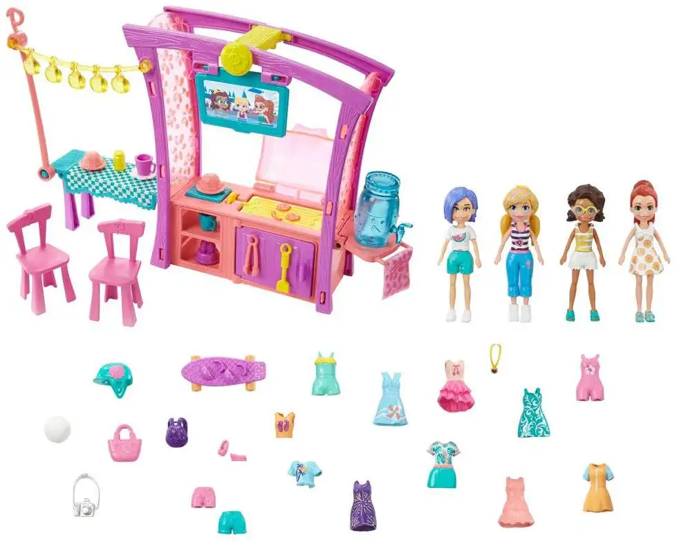 - Includes four 3-in/7.62-cm dolls (Polly, Shani, Lila and Bella Bigowski), a BBQ grill area, grilling utensils, condiments, an outdoor table with lanterns, two chairs, a drink, plates, cups, tote, backpack, camera, a volleyball, skateboard, several mix and max fashions and two extra pairs of shoes