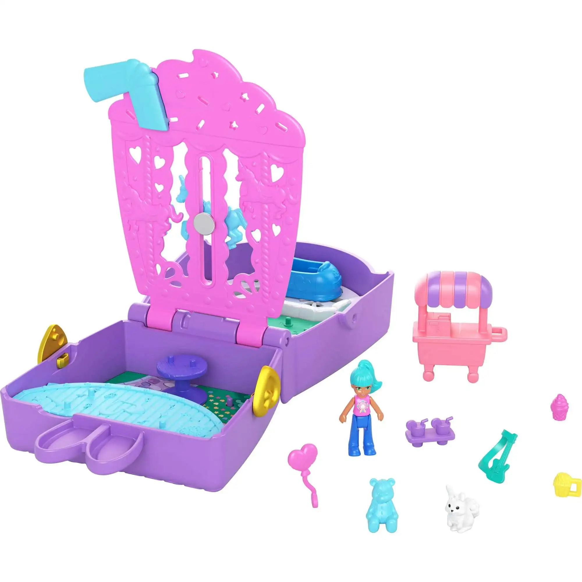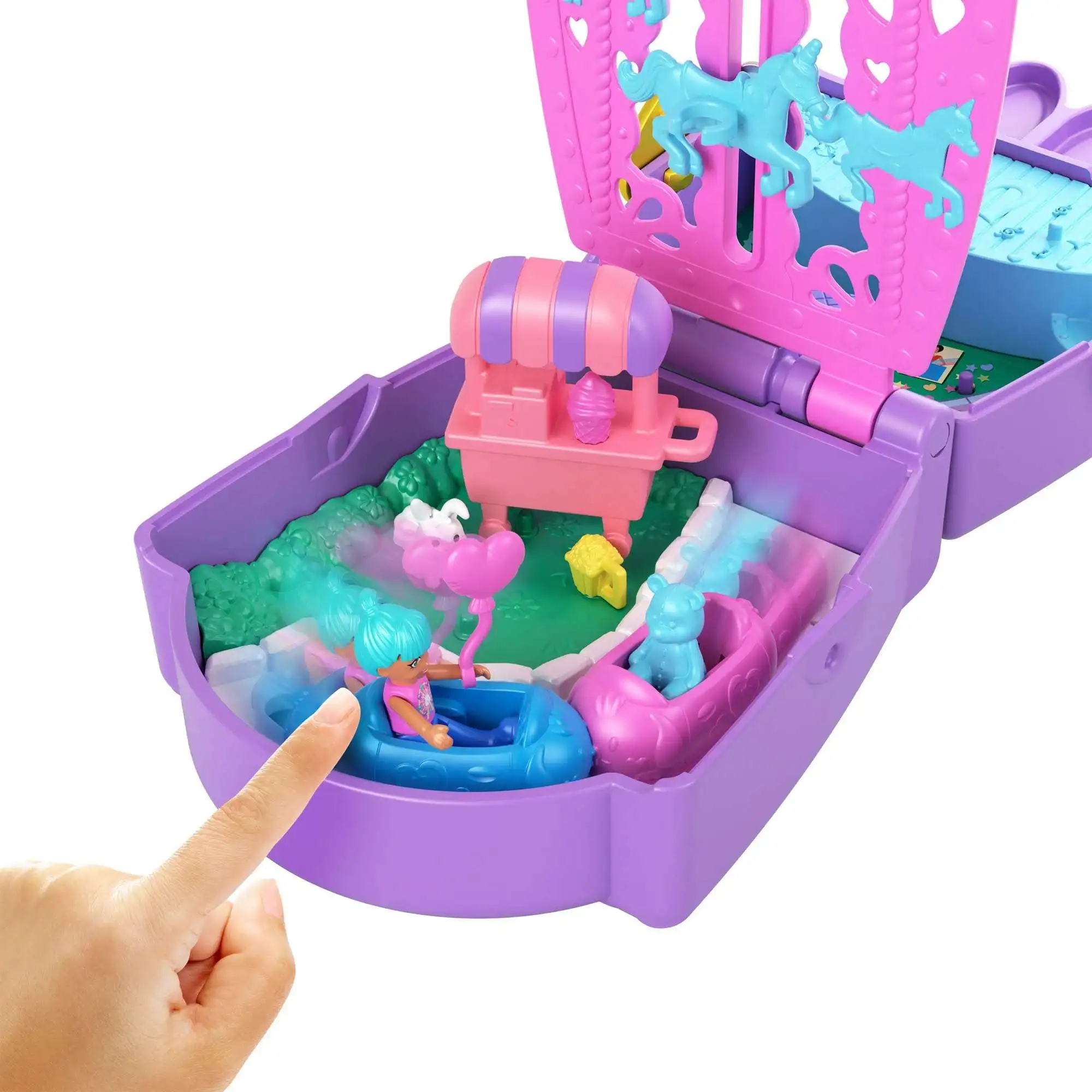 - The mini compact opens to an exciting carnival playground where dolls can share sweet treats from the ice cream cart or go for a ride on the unicorns that move up and down!