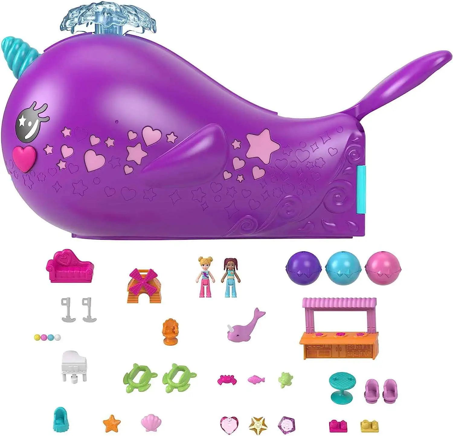 - All aboard the Sparkle Cove Adventure Narwhal Adventurer Boat that sets stories sailing with 2 dolls, 3 dissolvable pearls, 13 accessories, 2 levels, 6 play spaces, and water features!