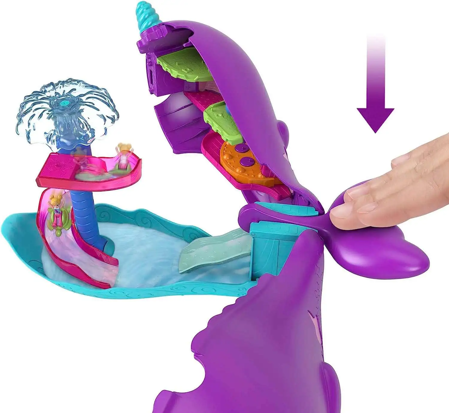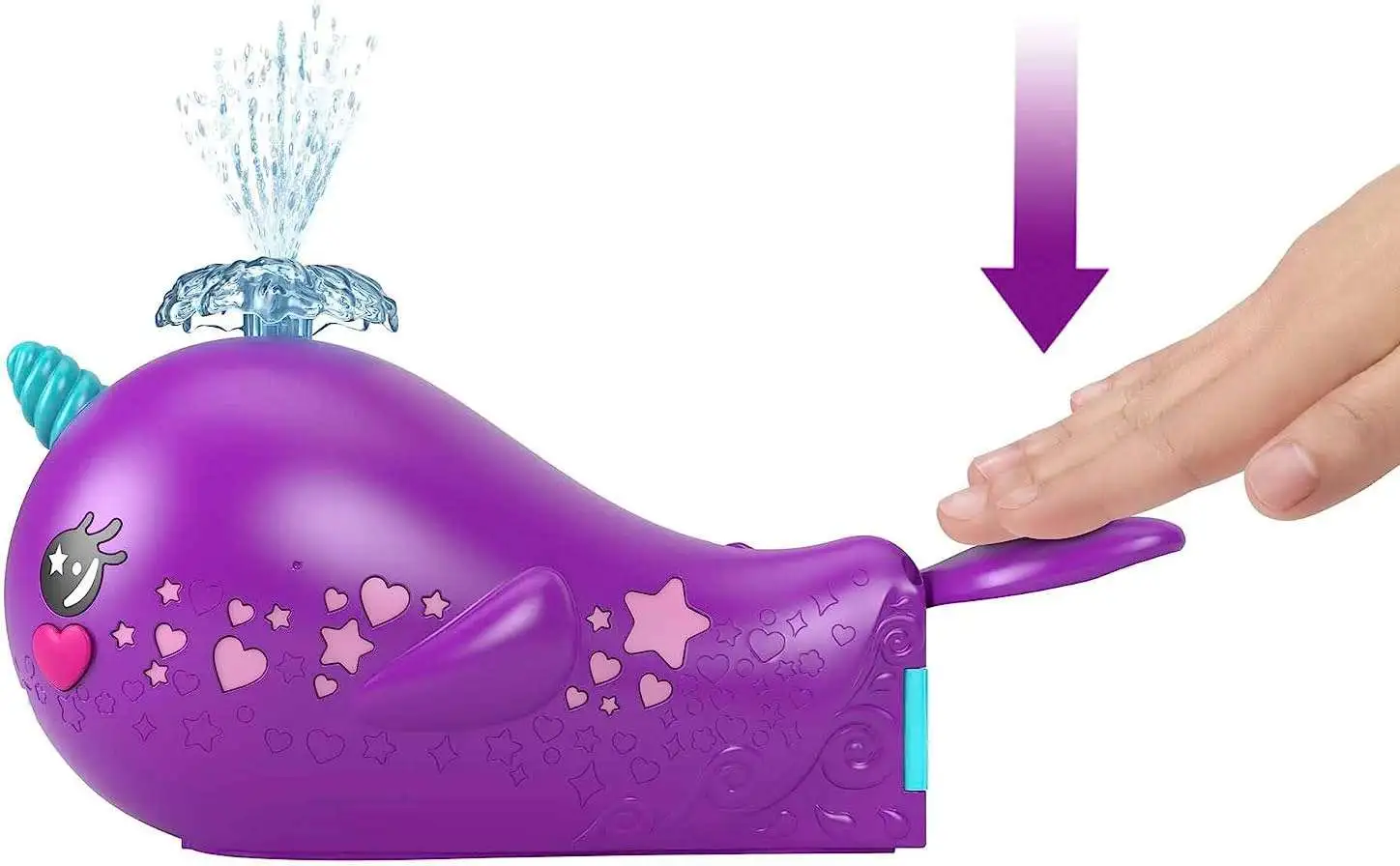 - Kids can fill the pool with water to activate the slide and press on the narwhal tail to spout water out of the blowhole!