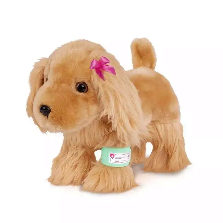 - 8-Piece Set: Includes an adorable plush Cocker Spaniel, a pink and blue carrier bag, and veterinary toys including a pink stethoscope, a medical bracelet, a bandage, a cast, a recovery cone, and more.