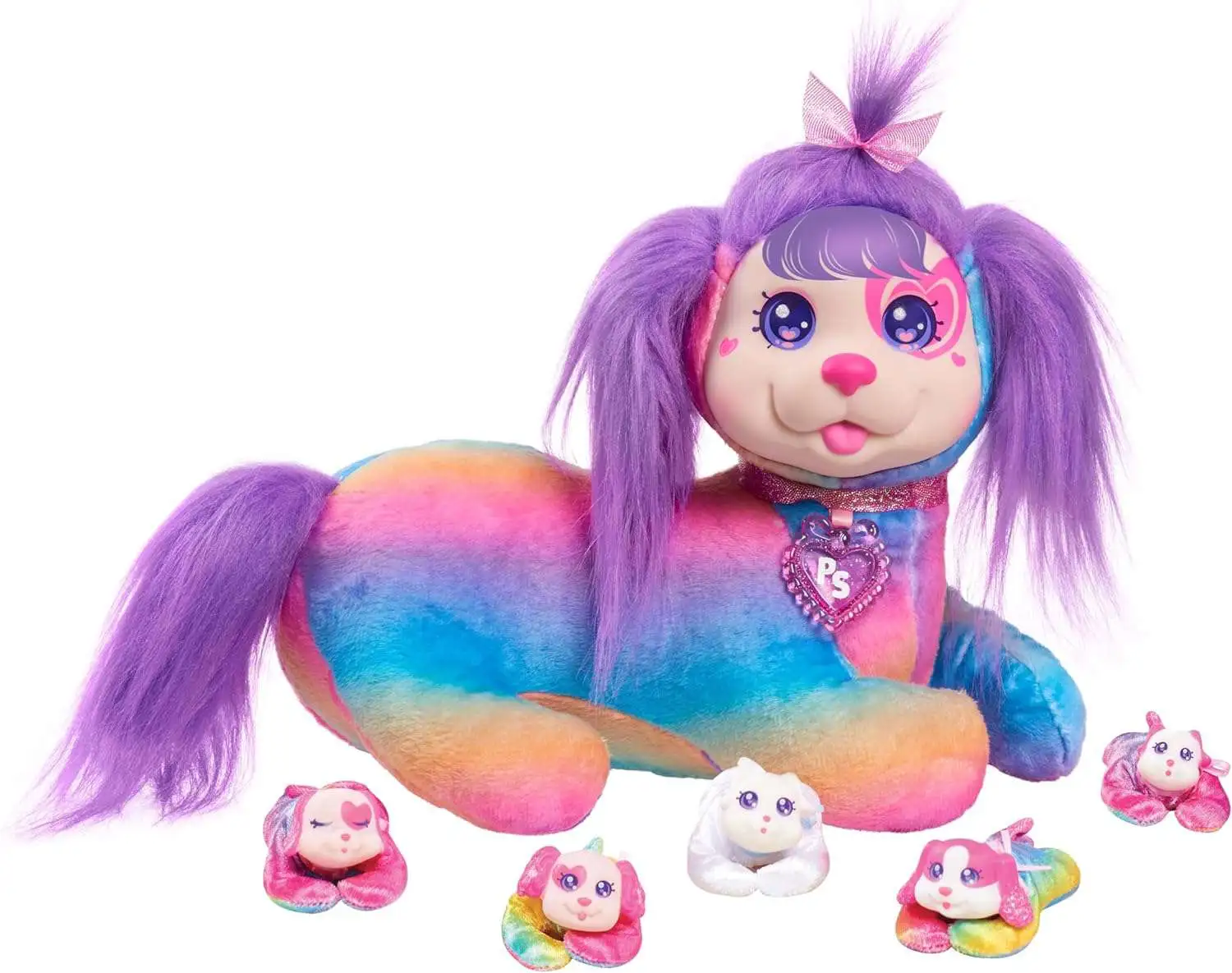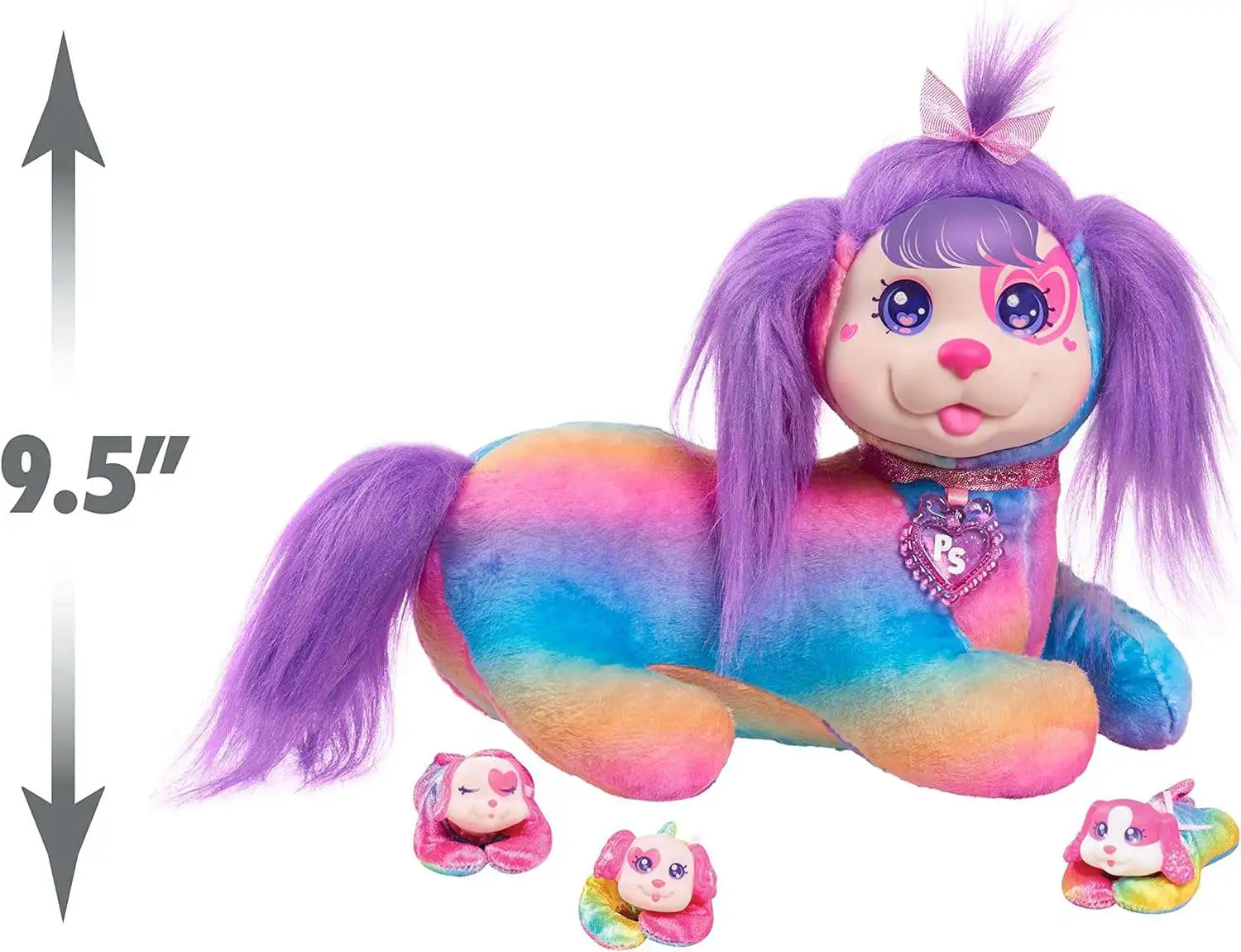 - Colorful Dog and Puppies: Cherry features super soft rainbow fur, purple ears and tail, and gorgeous details on her soft-molded face; her pups feature coordinating colors with unique, individual ears, markings, and coloration