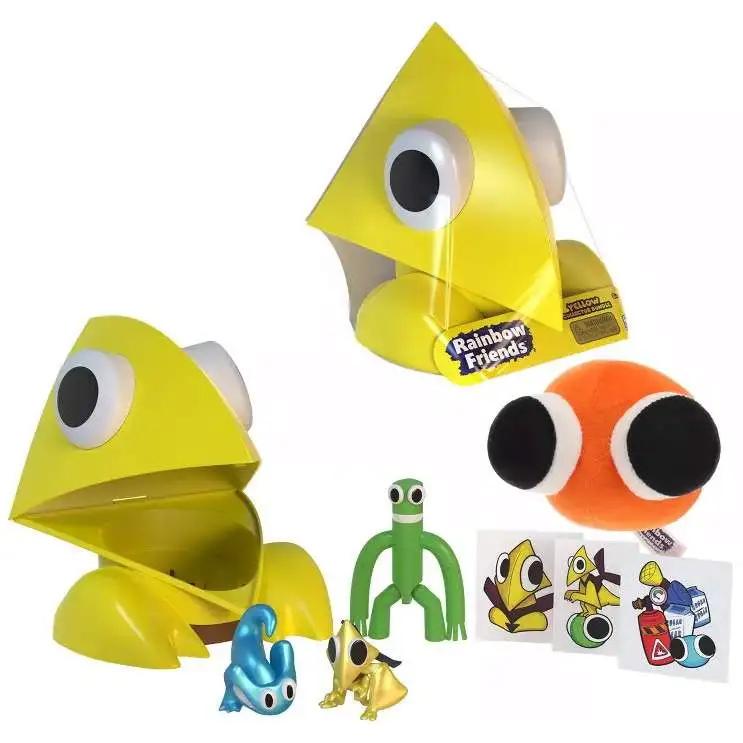 game, its the Rainbow Friends Yellow Collector Bundle! This reusable, 9-inch storage container features fan-favorite character, Yellow, and opens to reveal 7 great items inside! This incredible, instant collection includes, an action figure, a 4-inch Lookie plush, 2 minifigures, and 3 stickers! The Yellow Bundle also doubles as a creepy, cool piggy bank. Get yours today!