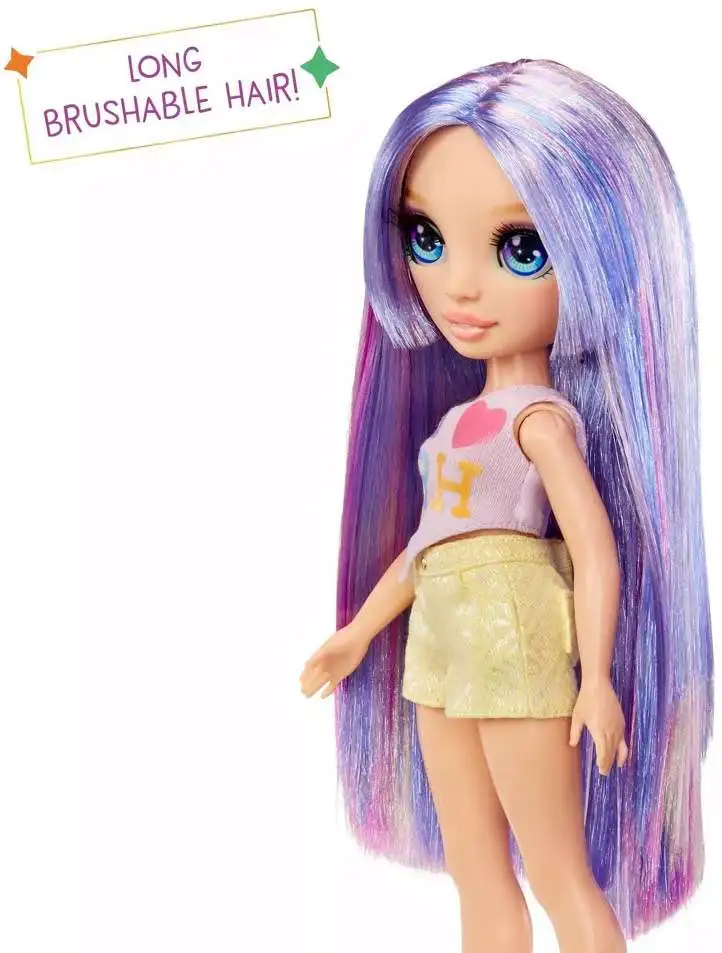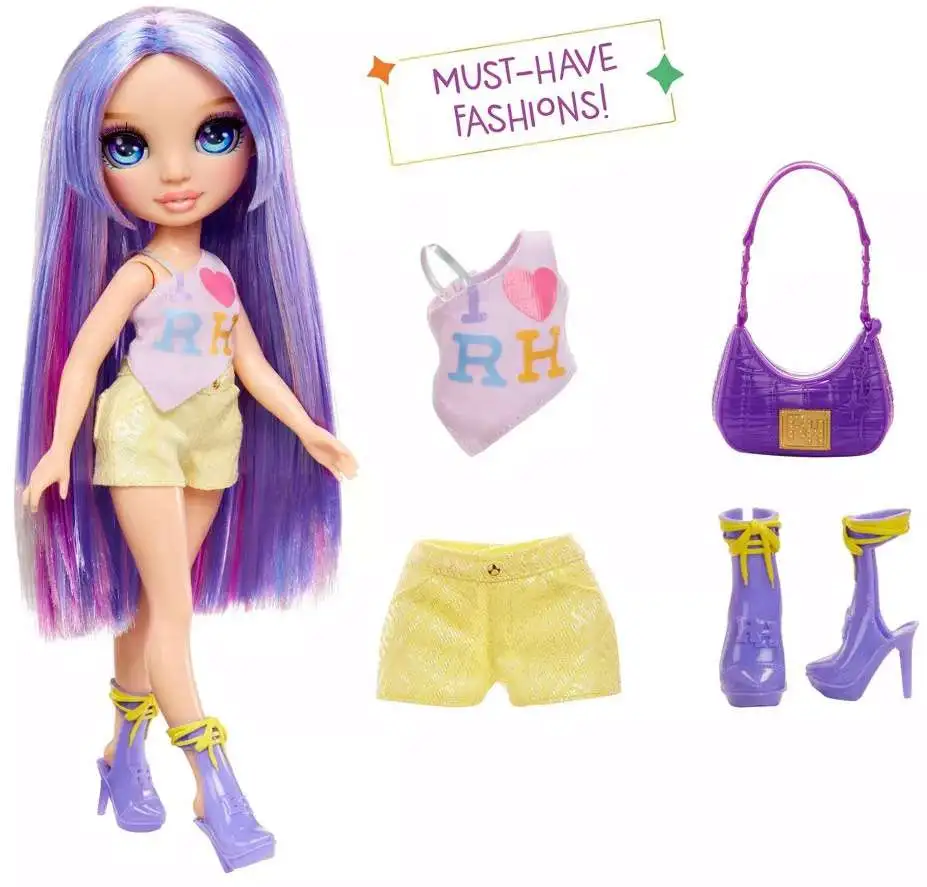 - UNIQUE STYLE: Everyone at Rainbow High has their own unique sense of style. Violet makes a confident statement in her purple "I Love RH" top, paired with iridescent rainbow shorts, eye-catching heels, and a luxe purple handbag that flawlessly completes her look.