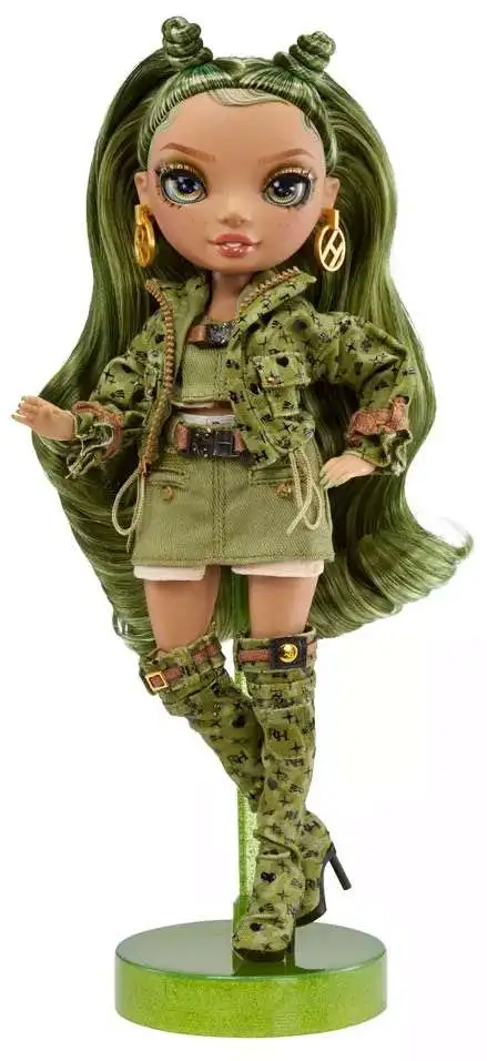 - CONFIDENT IN GREEN: Olivia is dressed in green from head to toe. She expresses her own style in a matching green top and skirt with belt detail, earrings, sunglasses, a pair of heeled boots with RH print and buckle detail, and fun accessories. And she has beautiful, green curled hair with two twist buns on top, long real eye lashes and glass eyes.