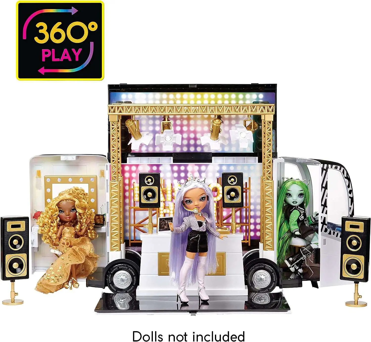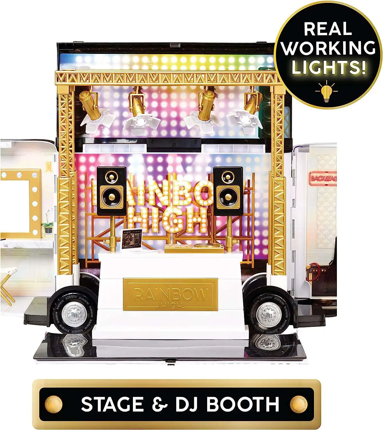 - WHAT'S INCLUDED- All the Rainbow Vision tour essentials such as Expandable Tour Bus, DJ Booth, 2 DJ Speakers, DJ turntables, laptop, 4 working spotlights, Vanity lights, vanity chair, eyeshadow palette, 3 batteries, and more. Recreate all your favorite Rainbow Vision storyline at home! Dolls Sold Separately.
