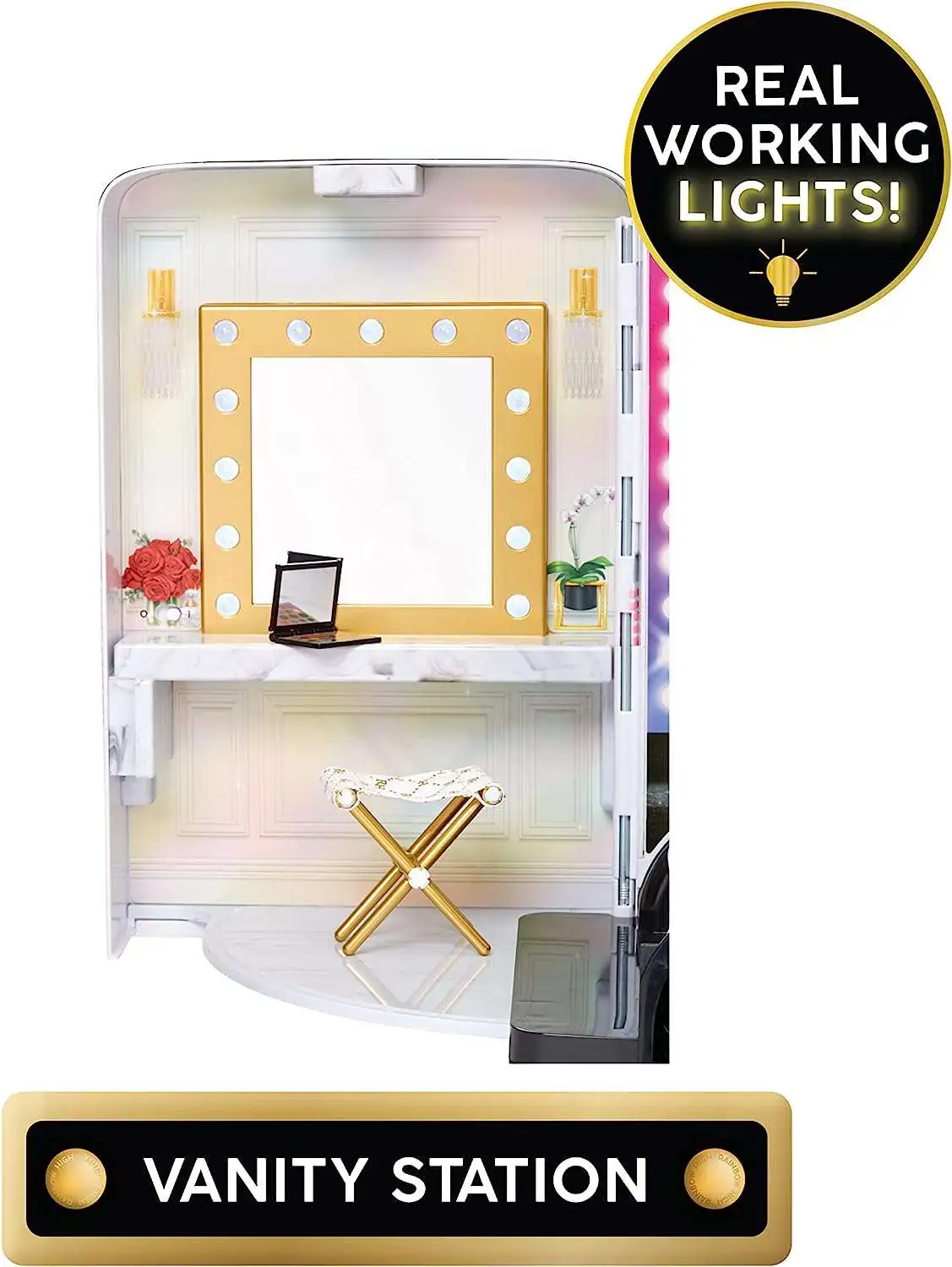 - 4 in 1 AREAS OF PLAY: The World Tour Bus & Stage is 360 degrees play and can transform to multiple areas of play. Dressing room and vanity. Performance Stage that expands to 33" wide and 18" tall. DJ booth with adjustable speakers, laptop, and spinning table! This playset inspires creativity and endless play for your child.