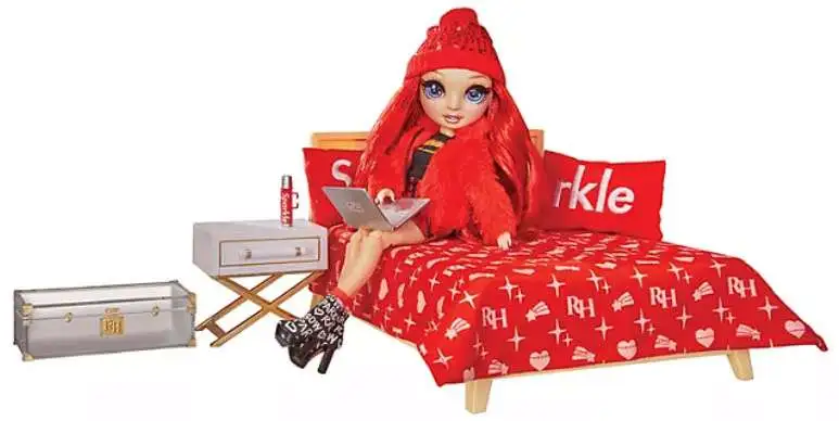 This Rainbow High Ruby & Dorm Room Playset Bundle includes a Ruby doll, a complete doll outfit, one pair of doll shoes, a pair of socks, a beanie, a comfy soft bed (mattress, base and headboard), a bright red comforter, two red pillows, an acrylic trunk, a nightstand with a drawer, a laptop, and a sparkle thermos.