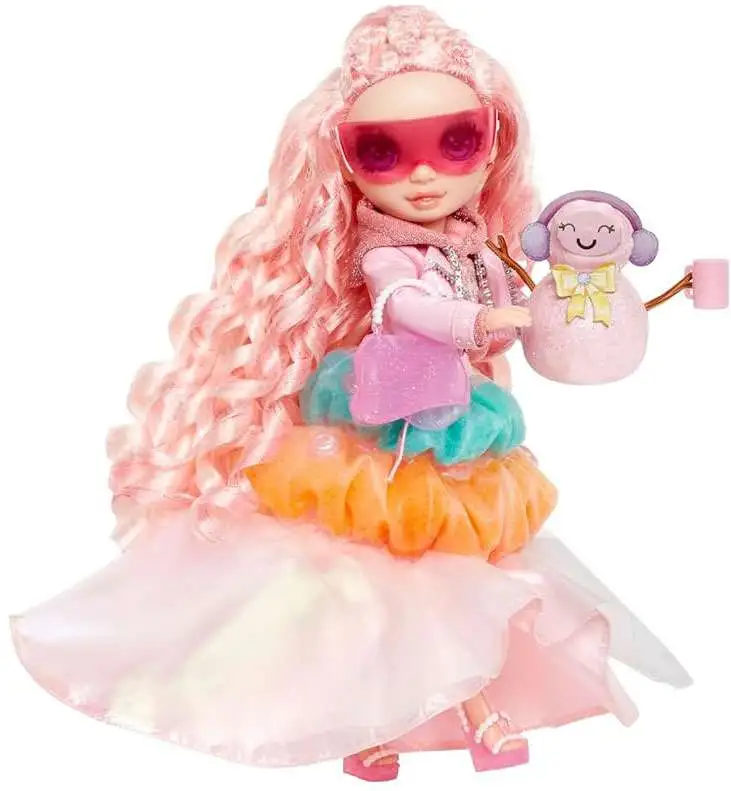 GORGEOUS WINTER WEAR: Bella is dressed in PINK from head to toe. She has gorgeous, detailed features in her fashion (hoodie, jacket and long skirt), matching pink shoes, purse and sunglasses. Her beautiful pink hair is partially pulled back in small braids on the top of her head with long flowy waves. She has long eyelashes and glass eyes. And her face shimmers in pink.