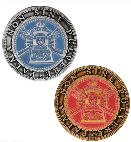 - Set of two limited-edition metal collectible coins inspired by Resident Evil 4, with a gold and silver finish accented by blue and red enamel.