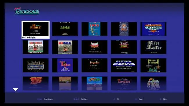 1942, 10-Yard Fight, 1943: The Battle of Midway, Air Duel, Armored Warriors, Bad Dudes Vs. DragonNinja, Bionic Commando, Blade Master, Boogie Wings, Captain Commando, Cobra Command, Commando, Double Dragon, Double Dragon 3: The Rosetta Stone, Dragon Breed, Exciting Hour - The Pro Wrestling Network, Exed Exes, Final Fight, Forgotten Worlds, Ghosts n Goblins, Ghouls n Ghosts, Gun.Smoke, Hammerin Harry, Heavy Barrel, Image Fight, Joe & Mac Returns, Joe & Mac: Caveman Ninja, Karate Champ - Player vs. Player, Ken-Go, Kickle Cubicle, Kid Niki: Radical Ninja, Knights of the Round, Legend of Hero Tonma, Magical Drop, Mega Twins, Mercs, Midnight Resistance, MotoRace USA, Mr. Heli, Mutant Fighter, Mystic Riders, Ninja Spirit, Pirate Ship Higemaru, Renegade, Secret Agent, Side Arms, SonSon, Strider, Super BurgerTime, Super Dodge Ball, The Combatribes, Three Wonders, Thunder Blaster, Varth: Operation Thunderstorm, Vigilante, Wizard Fire, XMultiply
