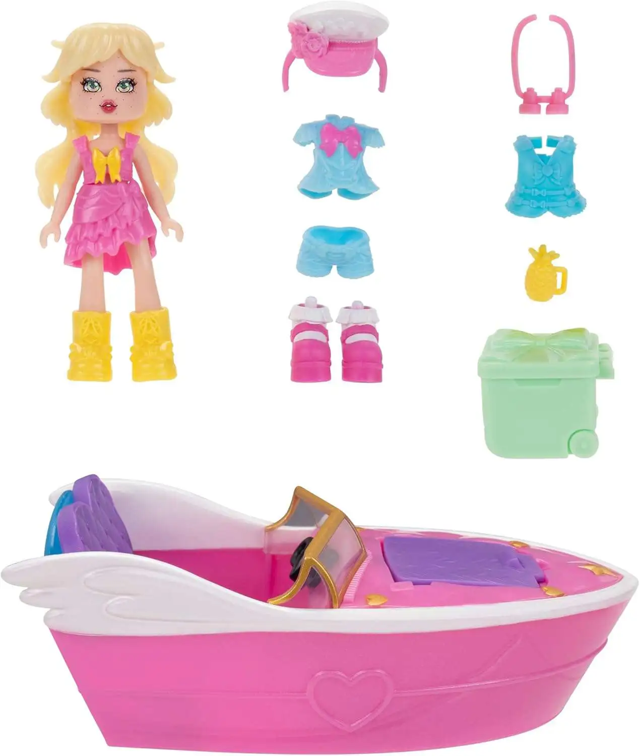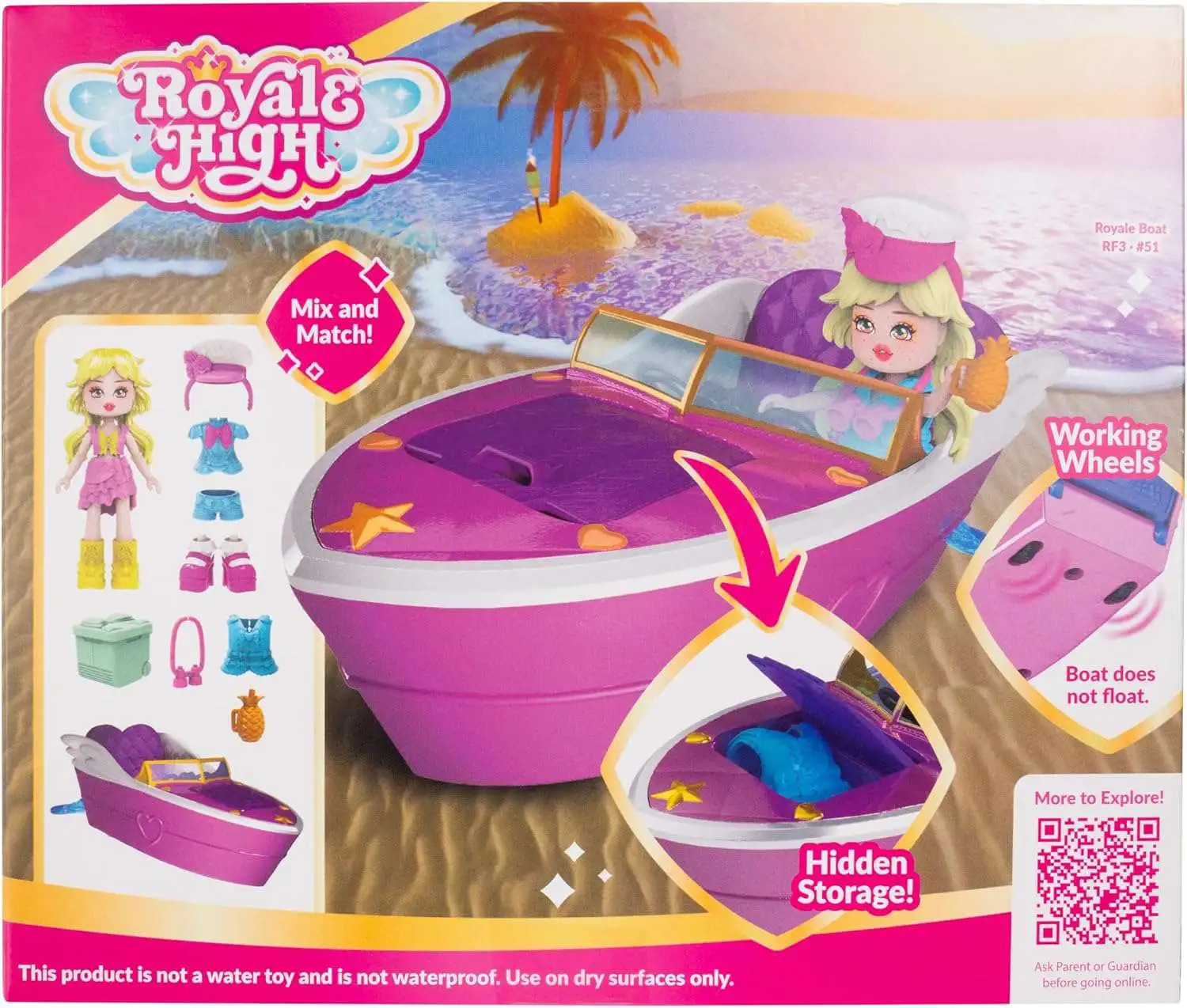 - ROYALE HIGH PLAYSET Experience the magic of Sunset Island aboard the Royale Boat! The doll can enjoy panoramic views, explore the scenery with binoculars, sip a refreshing pineapple drink, and switch up her outfits for a delightful evening on the water