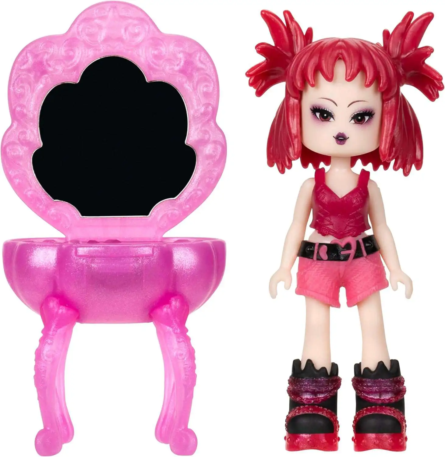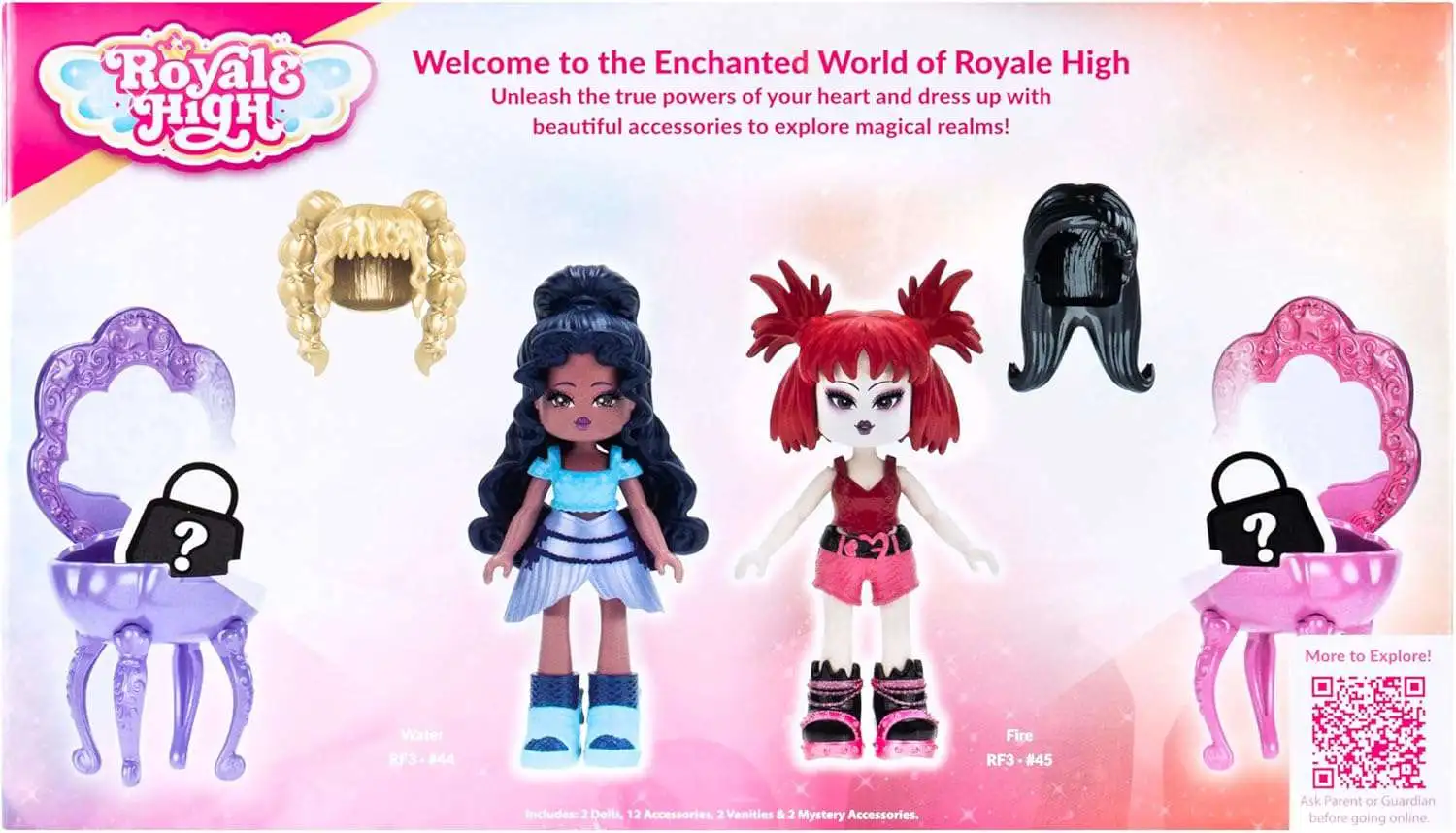- Features two 3" Royale High Surprise Vanity Dolls in Dark & Light themes with mix-and-match outfits for customizable style.