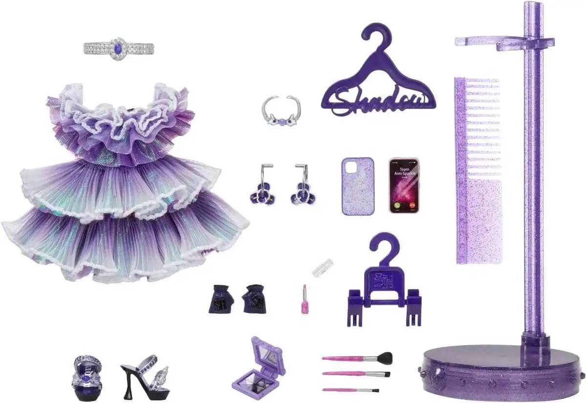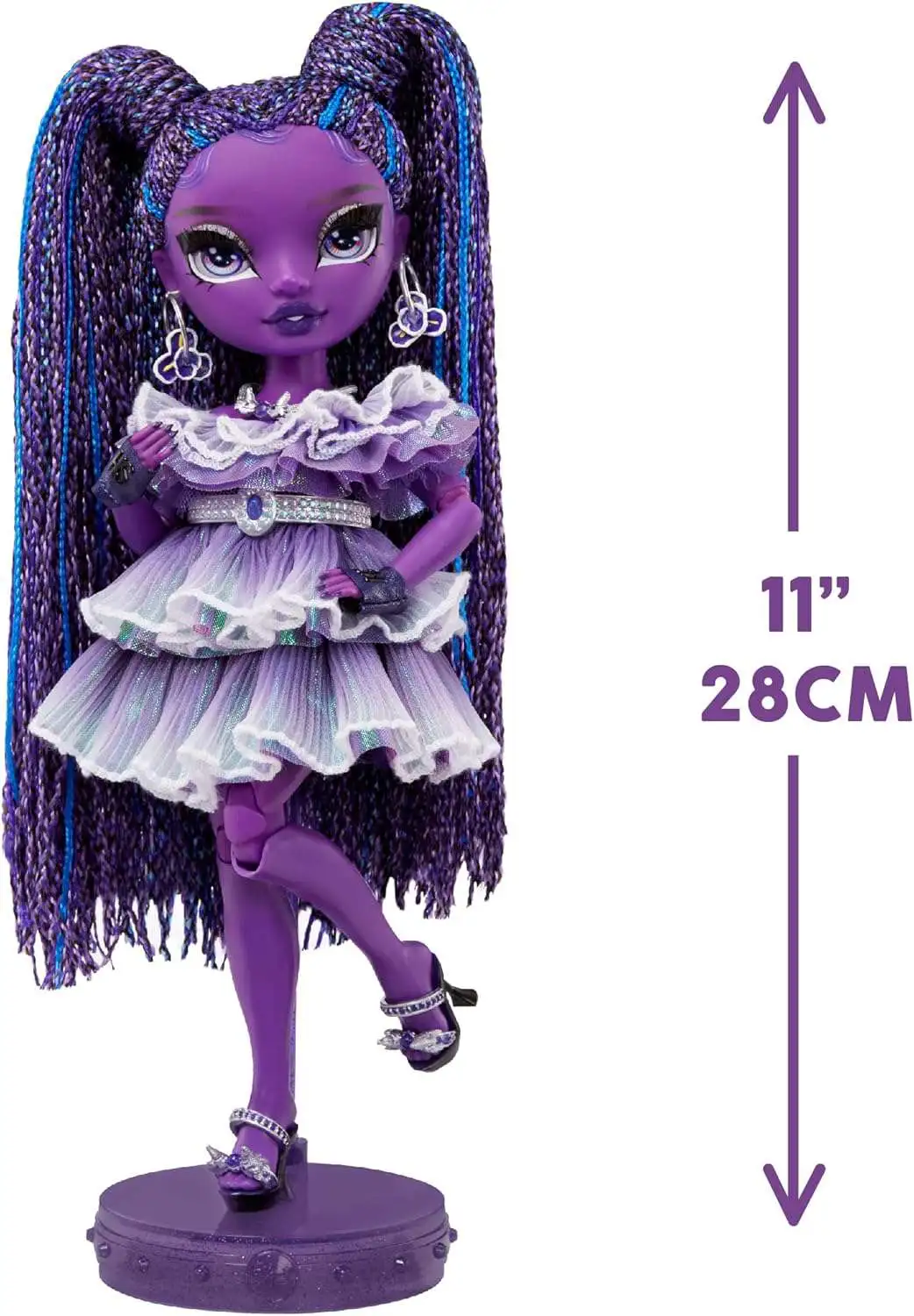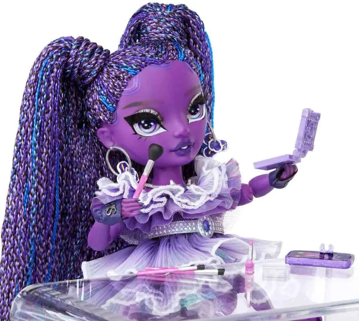 - EXPRESS YOUR OWN STYLE: Monique Verbena is dressed in purple, sparkle white, and silver from head to toe. She expresses her own style in a beautiful purple layered organza dress, diamond gem belt, purple sandals, gloves, and fun accessories. And she has beautiful purple long braids hair in two ponytails, long real eye lashes and glass eyes.