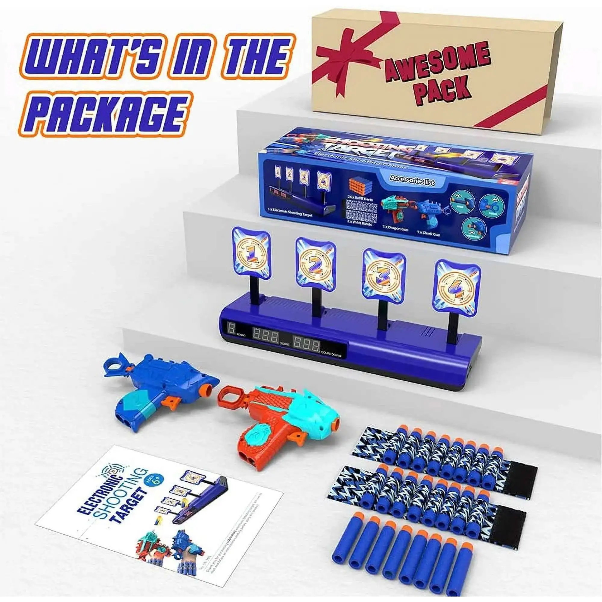 - 1* Electronic Shooting Target, 1* Shooting Blaster, 2 Darts Wrist Bands, 24* Soft Foam Darts