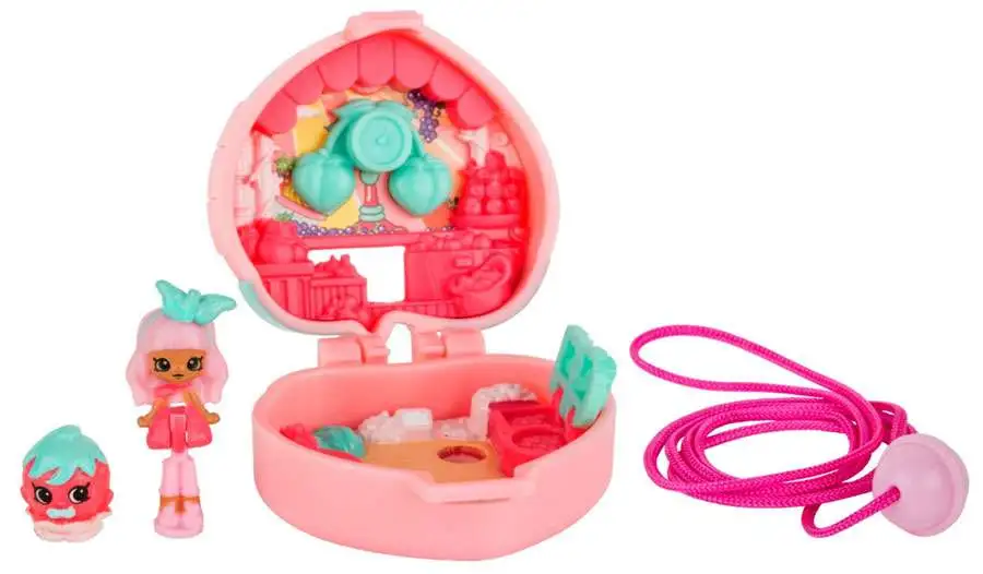 Peach shaped locket opens into Summer Peaches's Locally Grown Farmers Market. Features a fruit display that really opens, and a peach clock that really swings. Turn your Secret Locket into a necklace with the included lanyard. Also comes with a Teeny Shoppie, and a mystery Tiny Shopkin.