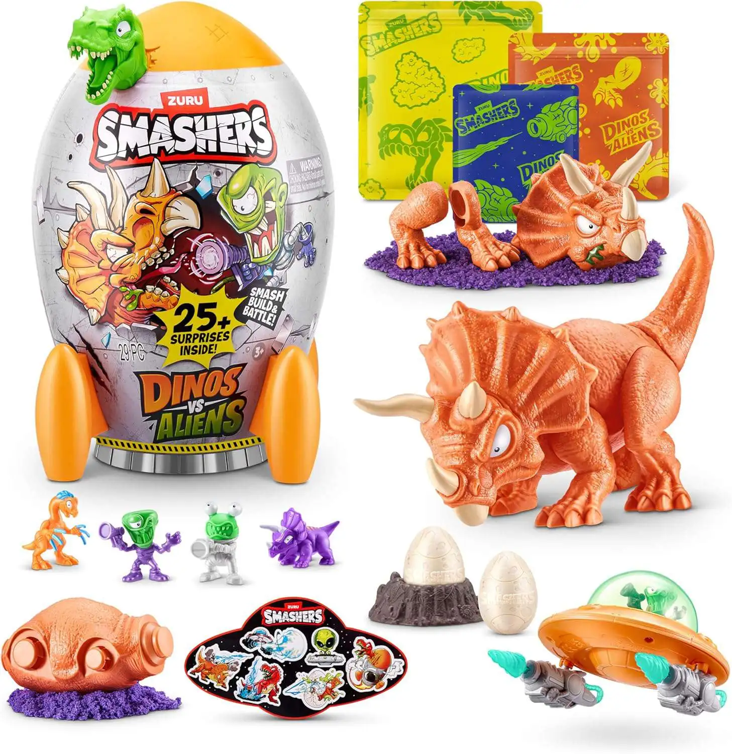 - Features a rocket ship for exciting smashing battles between dinosaurs and aliens.