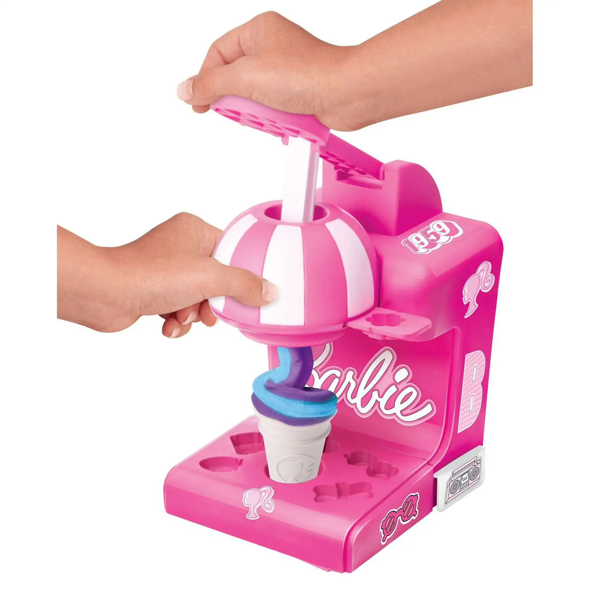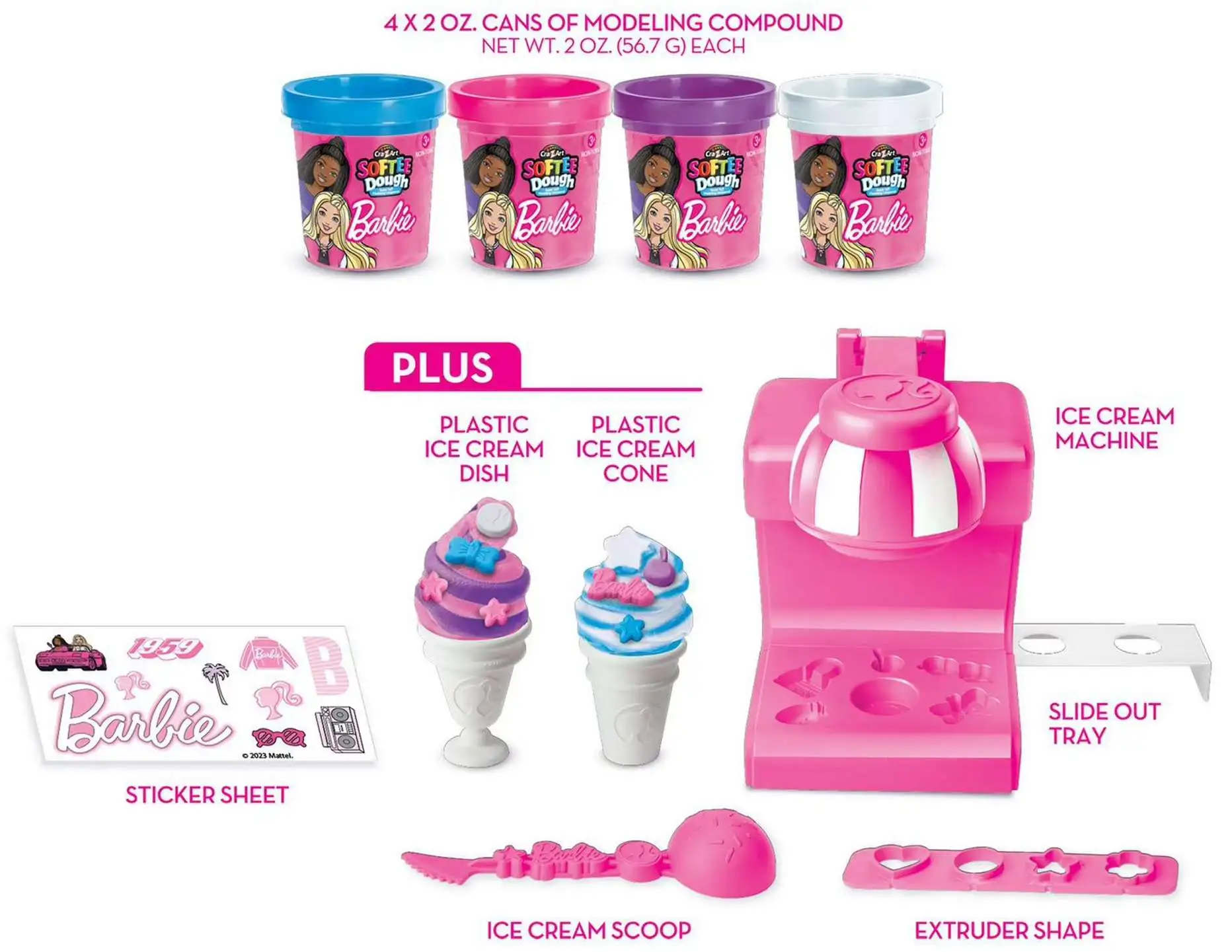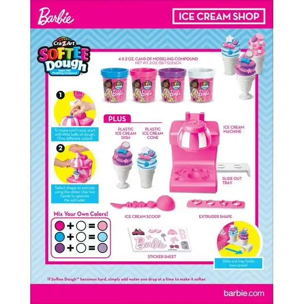 - Create your own delicious looking treats with this Barbie Softee Dough Ice Cream Shop! Have fun decorating the unit with the stickers on the included sticker sheet.