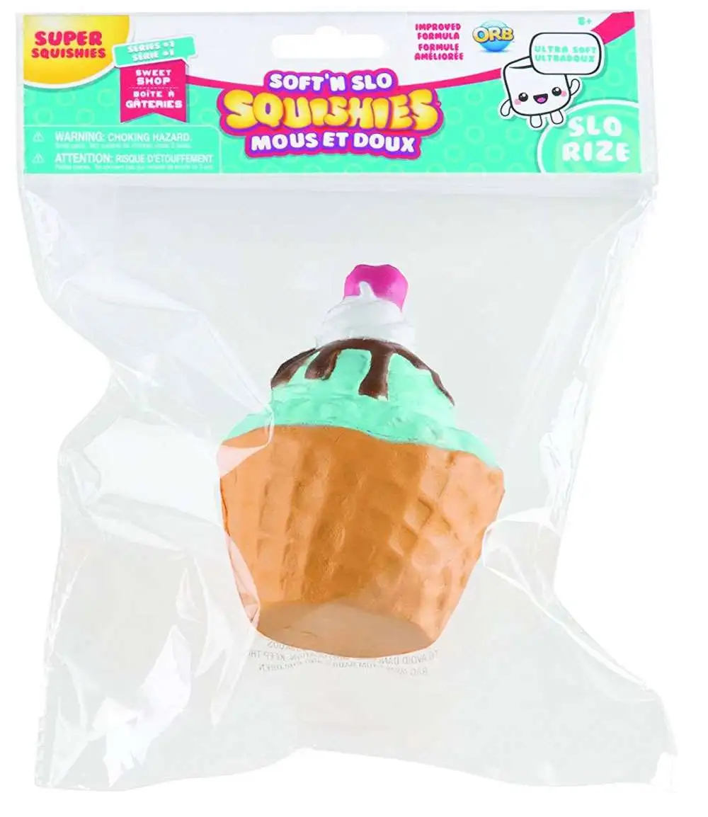 Softn Slo Squishies Sweet Shop are slow rising and ultra soft. Softn Slo Squishies Series 1 - Sweet Shop features your favorite bakery products, including cinnamon buns, ice cream cones, super squishy smores, cupcakes, macarons and more. Touch it, squeeze it, and watch your Softn Slo Squishies transform as it slowly rises!
