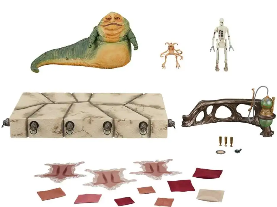 - Features Jabba the Hutt, 8D8, and Salacious Crumb figures in vintage-style packaging.