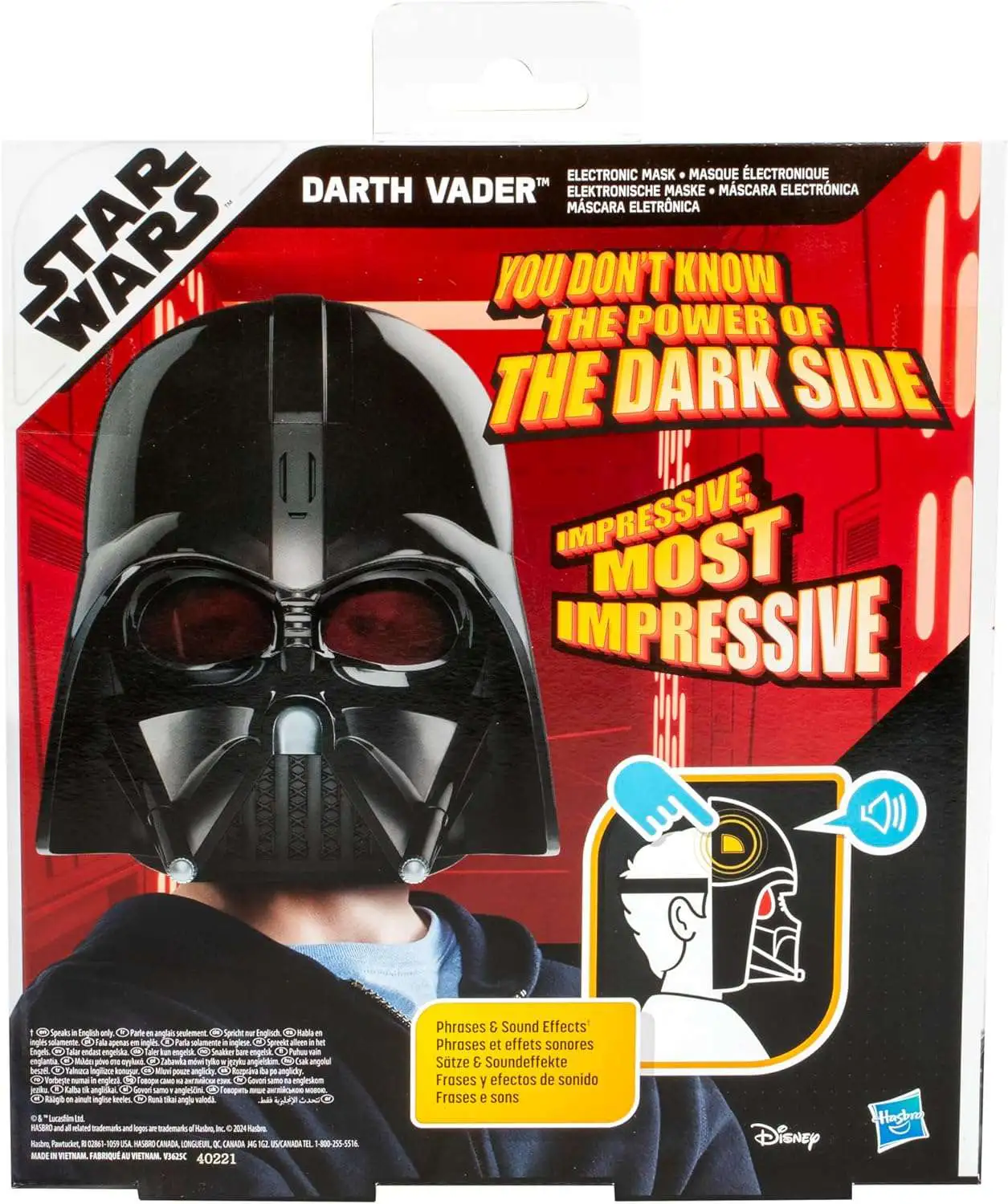 - Push the button on the side of the mask for sound effects and phrases like, "Impressive, most impressive" and "You don't know the power of the dark side" (Speaks in English only)