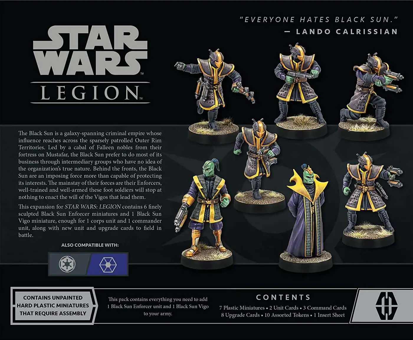 - BLACK SUN ENFORCERS: Reinforcements arrive to help the notorious Black Sun syndicate spread its influence across the galaxy in this expansion. Operating out of its fortress on Mustafar, the Black Sun makes ample use of criminal elements willing to take on any task for the right price.