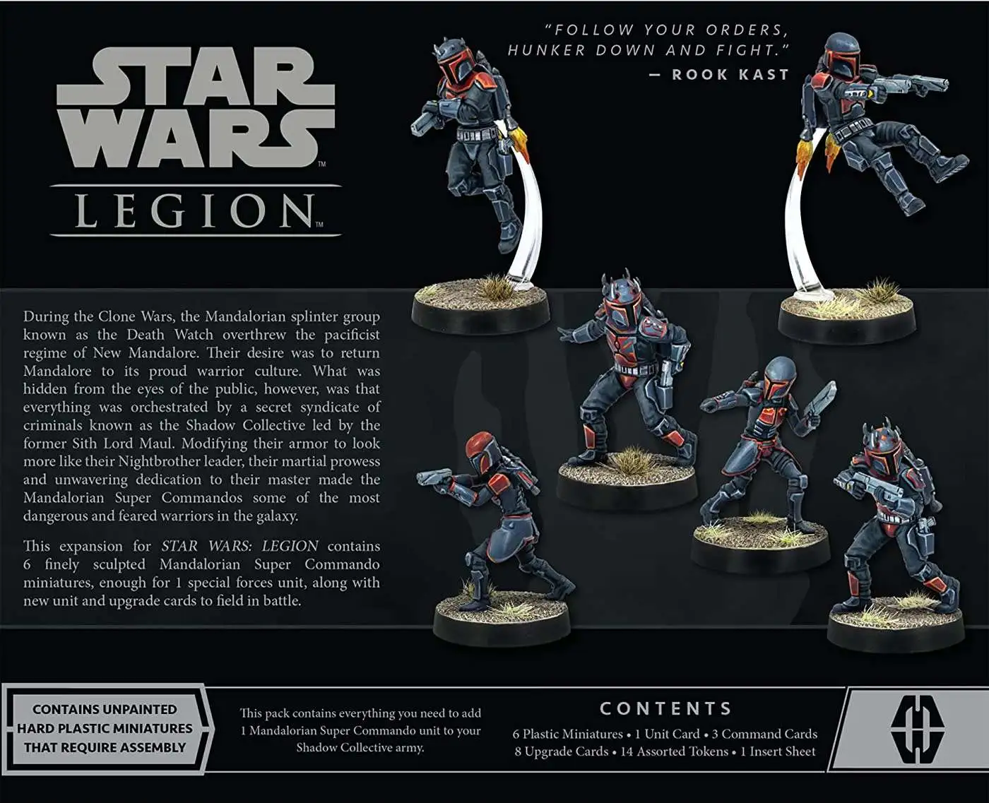 - A SHADOW COLLECTIVE EXPANSION: With them, players have a powerful new special forces option for their Shadow Collective forces. In addition to seven Mandalorian Super Commando miniatures and two unit cards, players will also find three command cards specifically designed for use with mercenary units.