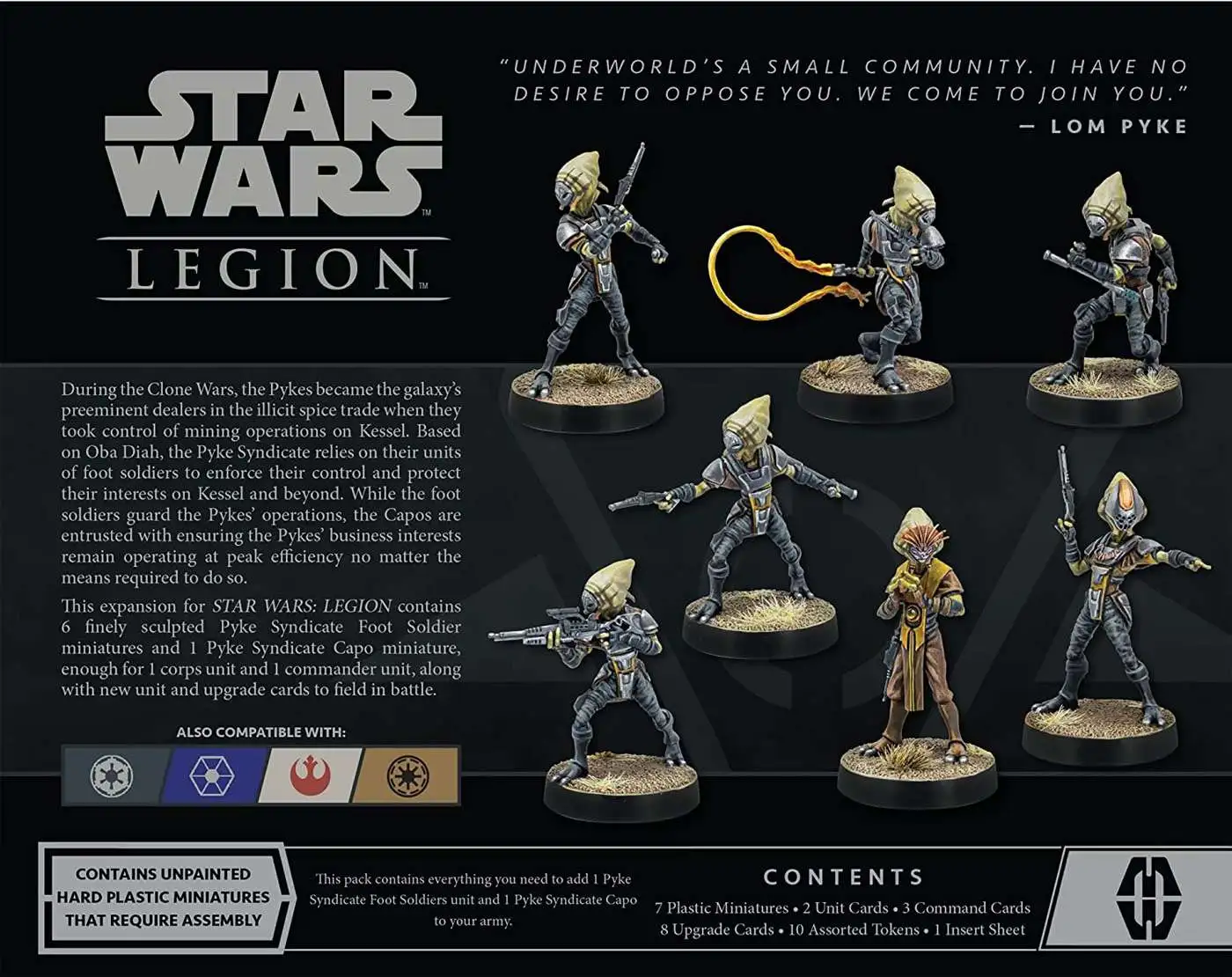 - PYKE SYNDICATE FOOT SOLDIERS: Players can hire additional soldiers to protect their interests throughout the galaxy with this expansion! Adding a corps unit of six Pyke Syndicate Foot Soldiers that can join Separatist armies or band together with their fellow mercenaries in the Shadow Collective, this set gives players even more versatile options for building their forces.