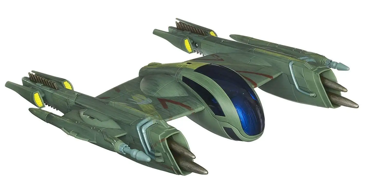 The ruthless bounty hunter Cad Bane flies a customized starfighter to track and capture his prey. The fighter is armed with laser cannons that Bane fires with deadly precision. His unsavory work for Count Dooku during the Clone Wars has him flying his starfighter to many planets throughout the galaxy. Launch yourself into action with this awesome Cad Banes Xanadu Blood vehicle! Its retractable landing gear, positionable thrusters, storage chamber and other intricate details make every battle feel more like the real thing. Meanwhile, the firing missile accessories make this a lean, mean battling machine! Fit a figure inside the opening cockpit (figure sold separately) and take control of this intergalactic vehicle to blast off for adventure!