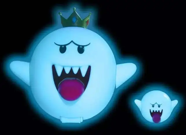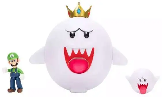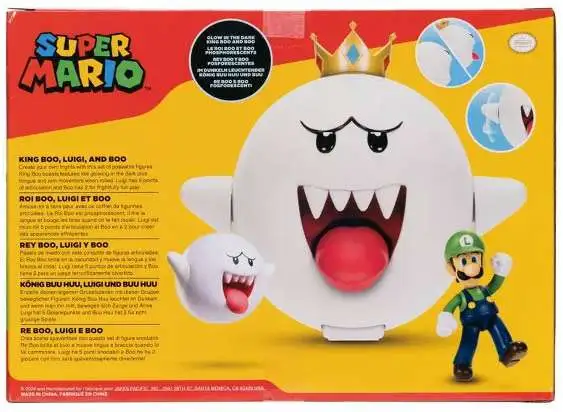 The King Boo Multi-Figure Set lets you recreate your favorite spooky scenes from the Super Mario video games. Create your own surprise encounter with this set of poseable figures including King Boo, Luigi and a Boo. King Boo has fun features including moving tongue and arms when hes rolled as well as glow-in-the-dark details. The Boo also glows in the dark and Luigi has 5 points of articulation! These figures are sure to please kids and collectors alike! Collect them all!