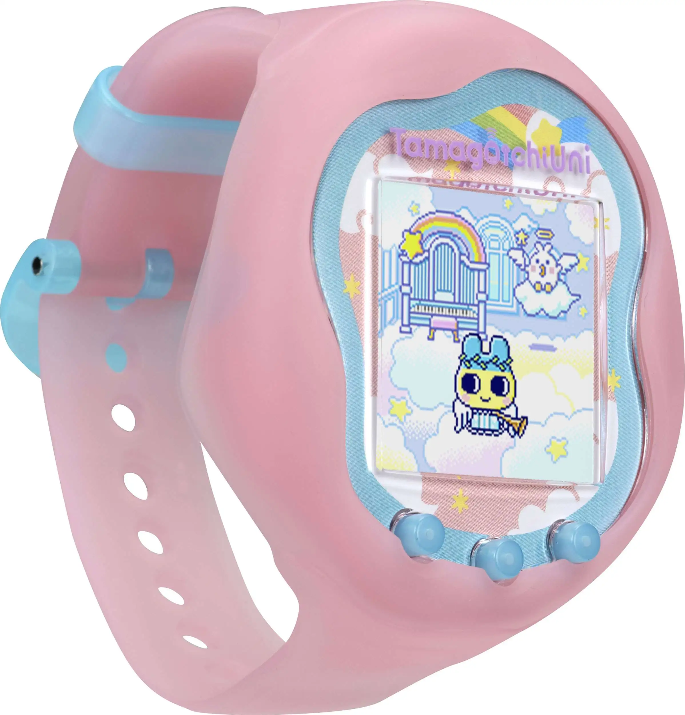 Tamagotchi Uni is the newest generation of your favorite interactive virtual pet with a pastel pink shell and allows fans to connect in the Tamaverse! The Tamaverse is the metaverse of the Tamagotchi world allowing fans from around the globe to play together in the Tama Arena, Tama Party, Tama Fashion and Tama Travel! Plus, with this product, you get a Tamaverse Ticket to travel to the Angel Festival through the Tamaverse where you can meet and play with the Tamagotchi Angel characters and enjoy mini-games with them! While maintaining its core Tamagotchi attributes of nurturing, communication, portability, and gaming, your virtual pet is better than ever - it's more Unique, United and Universal! Tamagotchi Uni also has various new features allowing fans their own unique experience, including DIY activities, exploring with your character and an in-device social platform. You can connect with your friend's Tamagotchi Uni to go on playdates, give and receive gifts and even marry! Plus, the Tamagotchi Uni comes with a translucent pink band so you can wear it on your wrist to take it wherever you go and interact with your UniTama in an all-new way! Comes with a rechargeable battery and USB-C cord. Ages 6+
