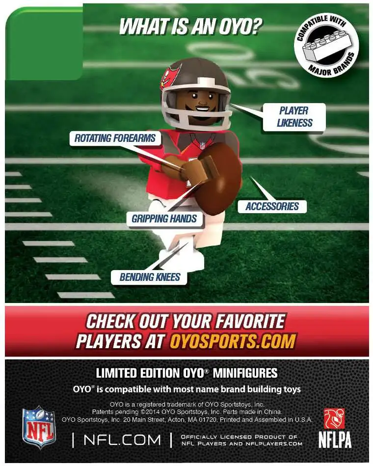 Each collectible minifigure comes complete with Buccaneers uniform, a football, Buccaneers helmet, removable face mask, water bottle, and stand with unique OYO DNA number. Each stand has a unique OYO DNA number to identify your one-of-a-kind sports toy. The custom OYO stand is great for displaying your Austin Seferian-Jenkins figure and connects to any building bricks. Collect all the Tampa Bay Buccaneers OYOs and hit the field! Ages 6 and up. Printed and assembled in the U.S.A.