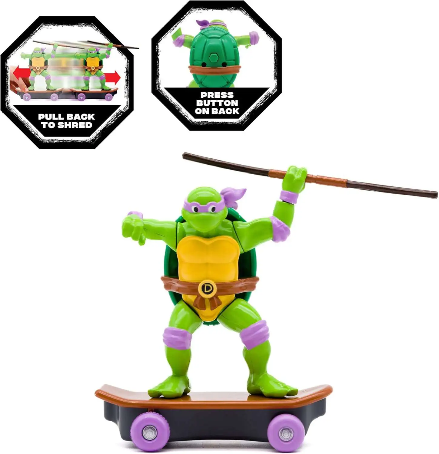 - Pull back toy and watch Donatello ride! Initiate battle mode by pressing Turtles' half shell!