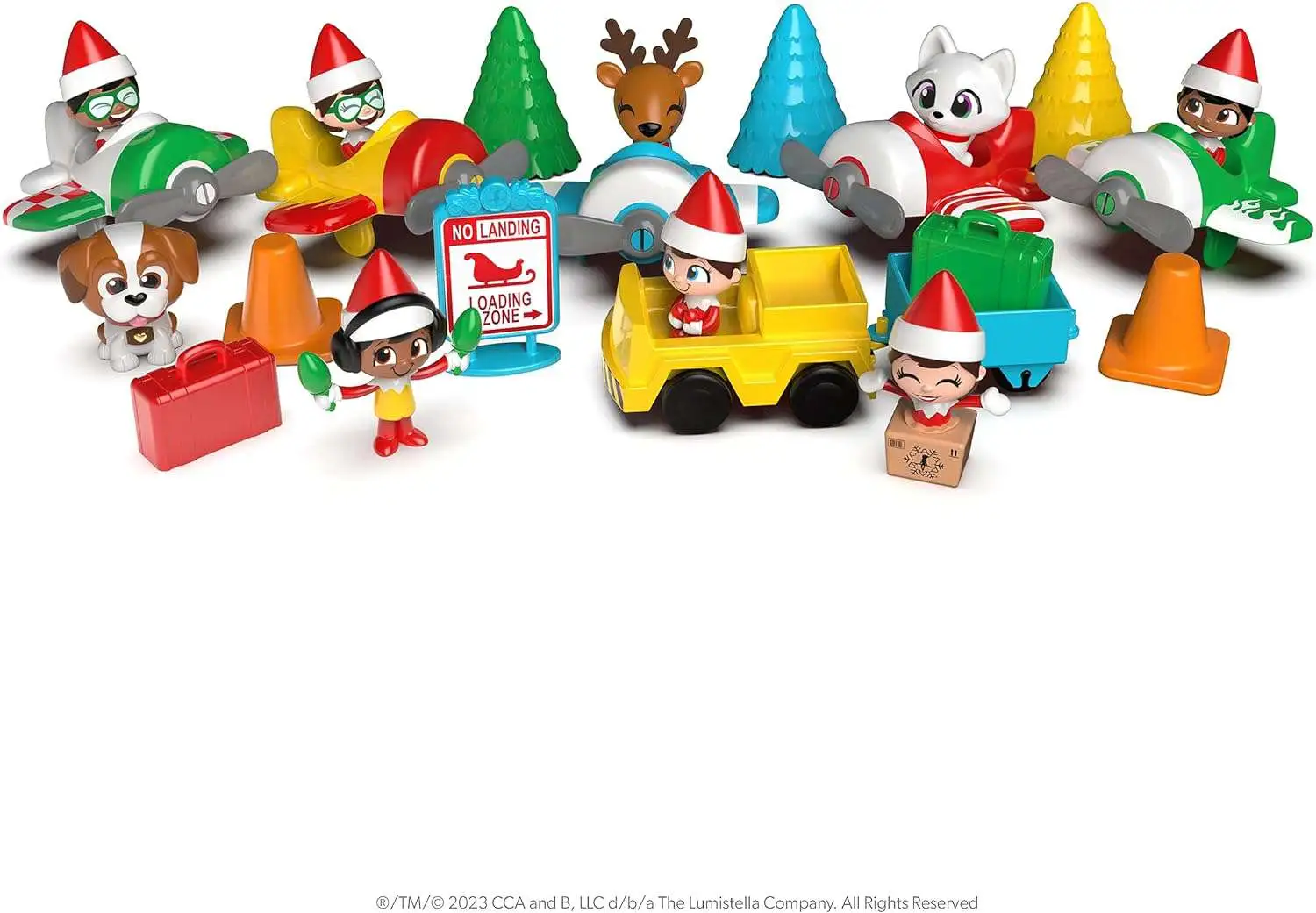 - Includes: 5 North Pole airplanes, 2 luggage train cars, 9 playable mini figures , 1 sign, 2 luggage pieces, 3 trees, 2 traffic cones.