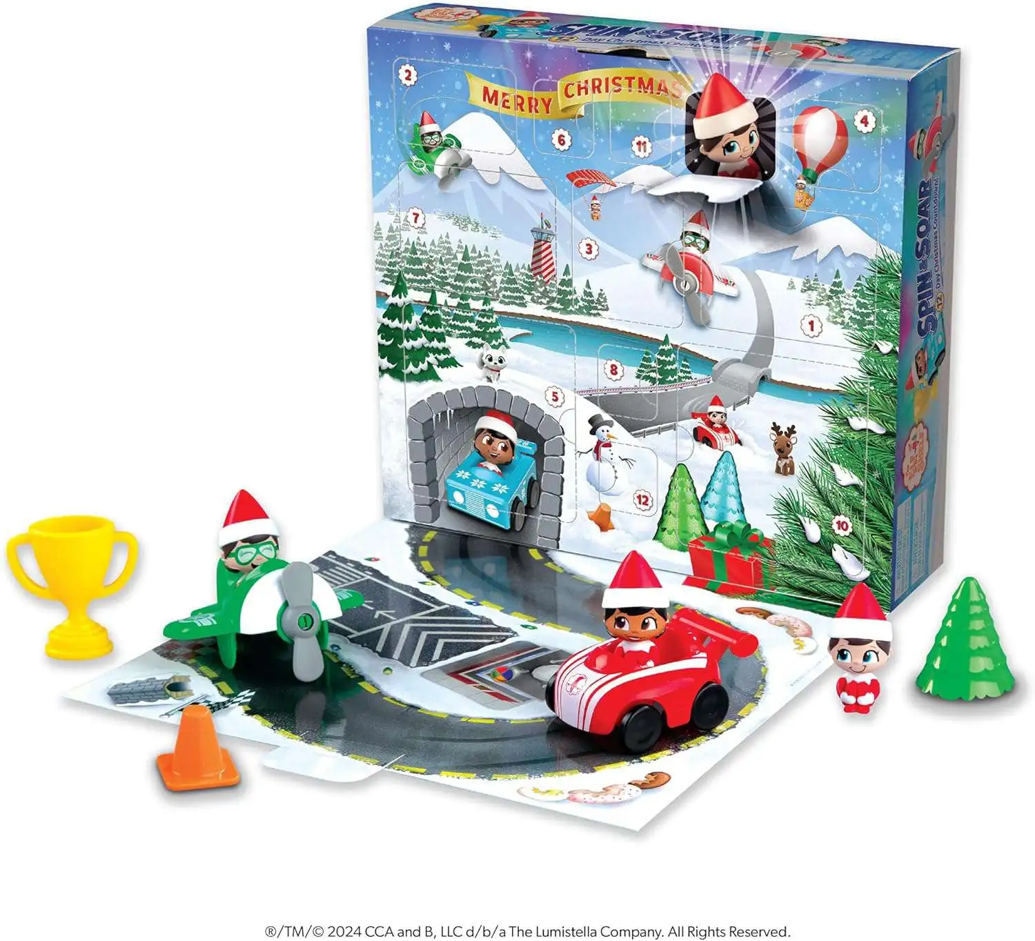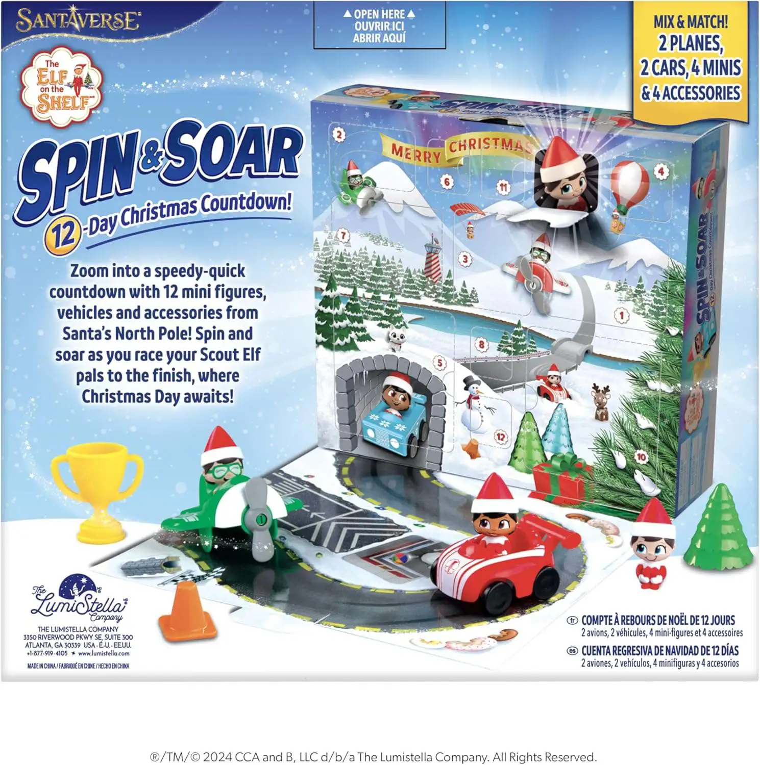 - The Elf on the Shelf Christmas Countdown Calendar: The race is on! The Elf on the Shelf Spin & Soar set includes The Elf on the Shelf toys you can mix and match for 12 days leading to Christmas day. Get 4 Scout Elf mini-figures, vehicles, and accessories for one fun calendar for kids 3 years and above.