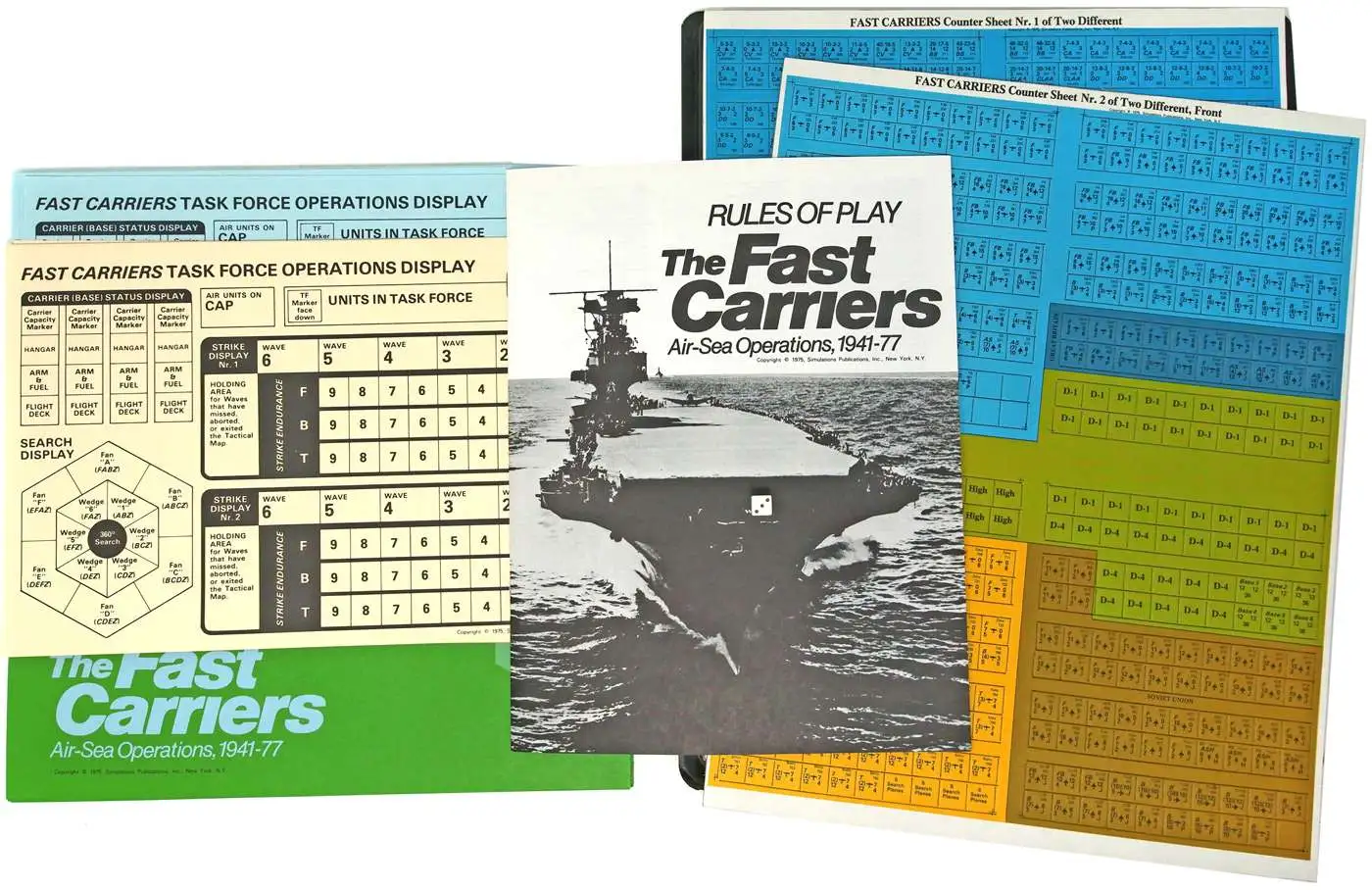 Fast Carriers is SPI's simulation of WWII carrier warfare and it's impact on combat tactics in the pacific. Simple sea/island maps with large hexes are used to position task forces and flight sorties. A place mat for each active carrier is used to track carrier operations. All individual combat planes and ships are represented with search planes abstracted. Tactical air to ship combat is played out on a tactical hex based all sea map with individual plane altitude, angle of attack, and multiple waves of aircraft represented.