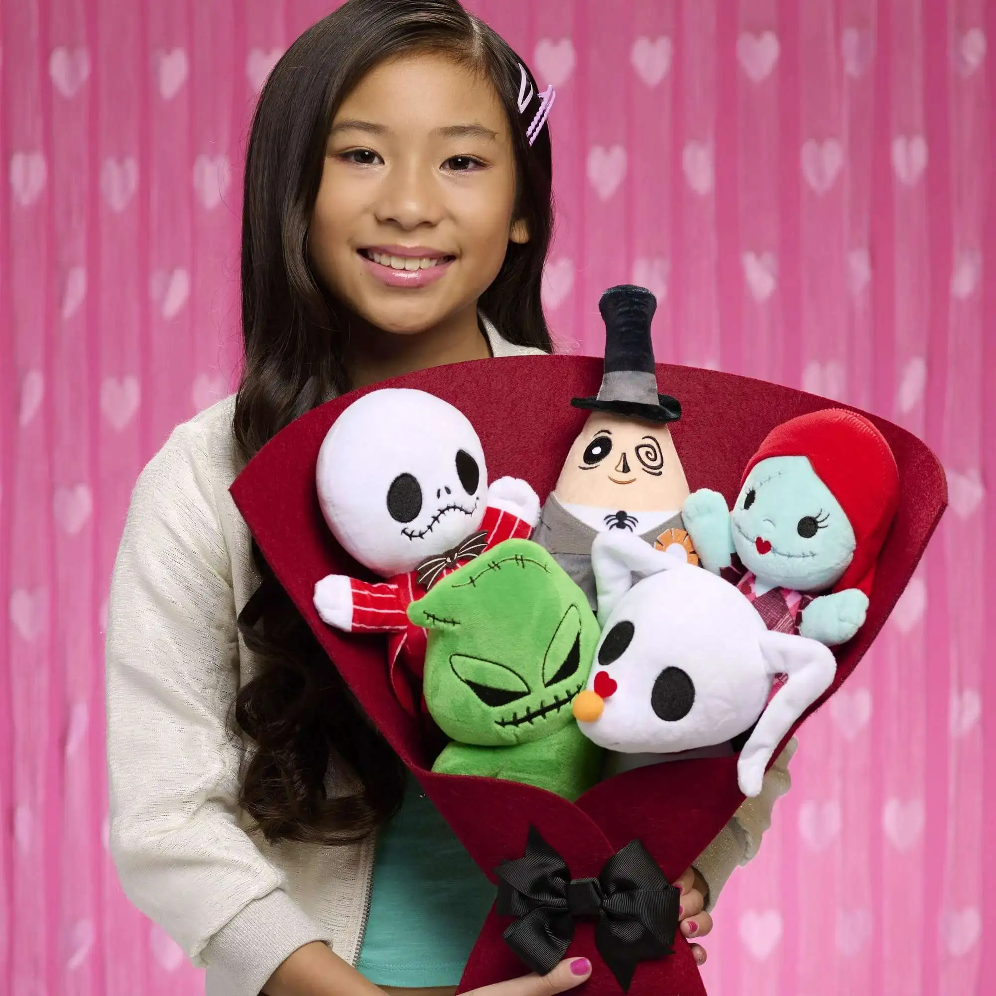 - Bouquet Full of Plushies: Wrapped in a dark red fabric sleeve with a black satin bow, this 14-inch fabric bouquet is a boo-quet like no other. It features 5 The Nightmare Before Christmas plushies for a big dose of heartwarming cuddles.