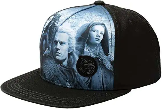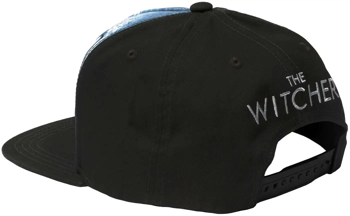 Black snap back hat featuring printed design on front of cap with woven patch and The Witcher logo embroidered on back