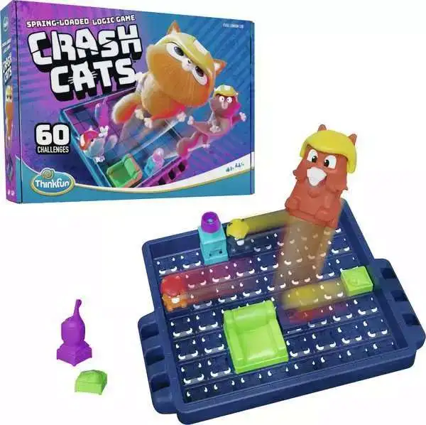 Introducing Crash Cats by ThinkFun, the sliding back block puzzle that sends cats flying! Pick the challenge, set up the board, and slide those cats! The cats slide all the way until they are sent flying. Crash the yellow helmeted cats so only the red helmet cat remains. With challenges from beginner to expert, you'll be sliding and crashing cats for hours.