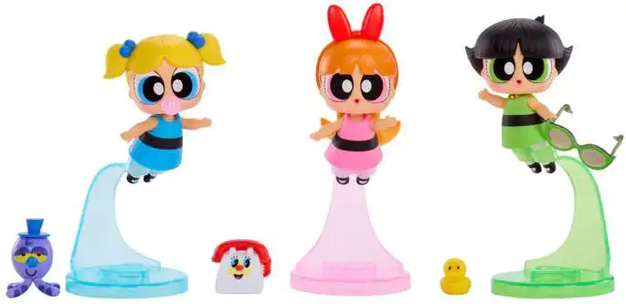 Each doll comes with fashions and accessories inspired by each Powerpuff Girls signature color. an adorable housing ball reflecting the face of each character, and a doll stand for the Tots to pose in their classic flight poses!