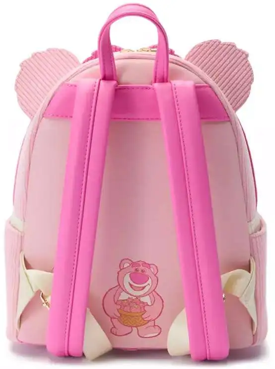 - Simulated leather back with screen art Lotso, Double zipper main compartment with Loungefly logo metal pulls
