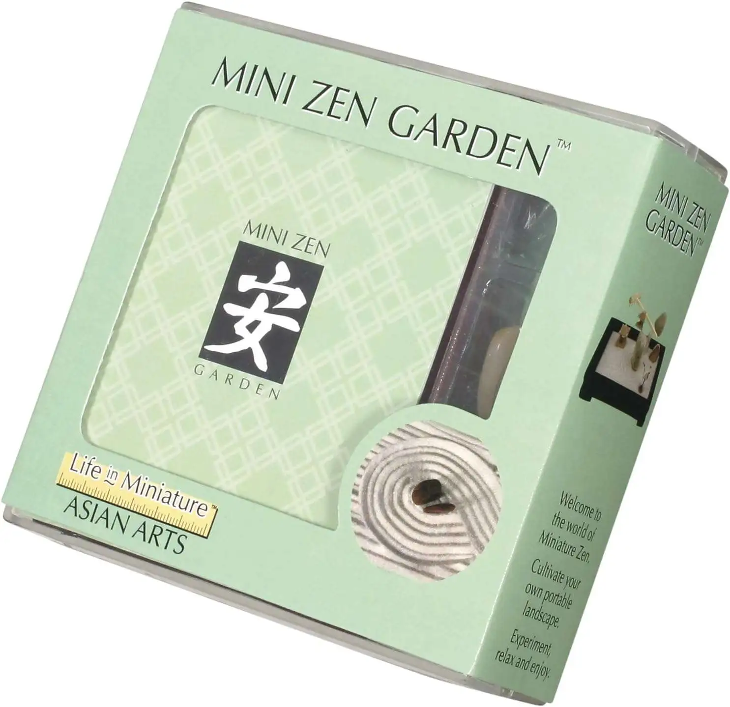 - Features picturesque white sand, a wooden rake, colorful polished stones, mini ceramic crane, and architectural figurines for creative Zen arrangements.