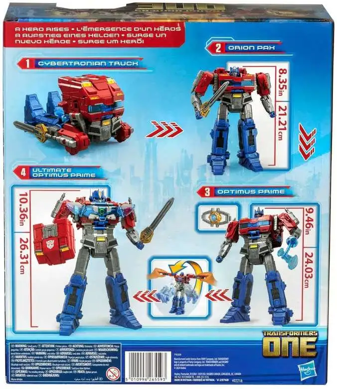 - Movie-inspired Optimus Prime toy grows in height from 8-10 inches (20-25 cm) and changes between 4 different converting modes: Orion Pax, Cybertronian Truck toy, Optimus Prime, and Ultimate Optimus Prime