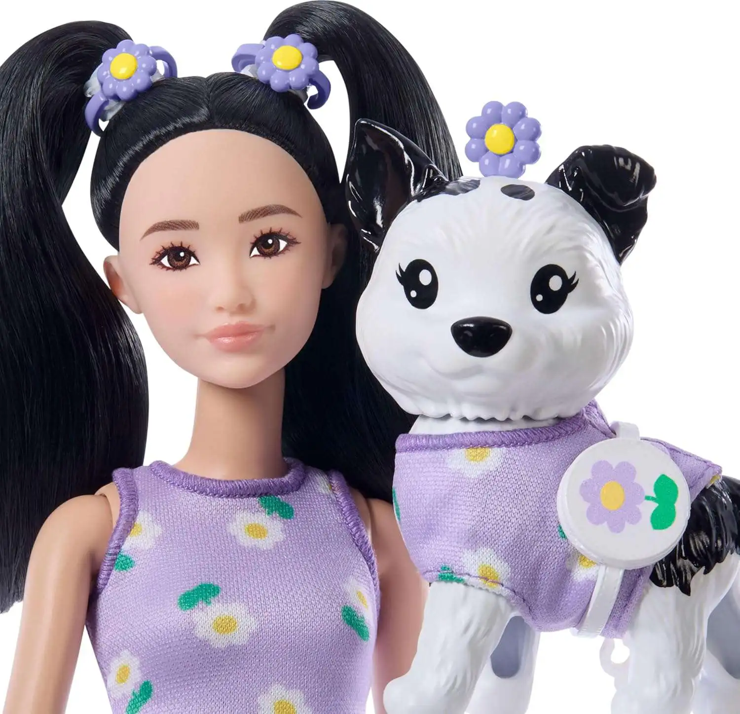 - Accessorize Barbie doll's pigtails wit two daisy barrettes, and her outfit with a daisy watch. Plus, her puppy comes with a yellow collar, leash, and matching purple flower for more twinning fun.
