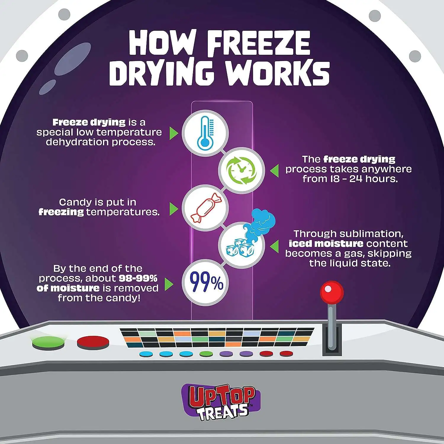 HOW IT WORKS: The freeze drying process is a special temperature dehydration that removes nearly all moisture in the candy resulting in a light and tasty crunchy treat suitable for backpacking, camping, or for those who want a unique take on a classic candy!