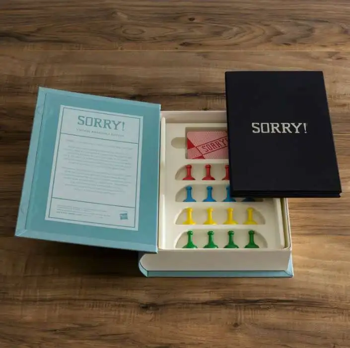 This collectible bookshelf edition was inspired by the original SORRY! game that was first brought to the US by the Parker Brothers. The same family game that has been enjoyed for generations is now packed neatly in a stylish fabric-wrapped book. This edition is truly a tribute to its history and will allow you to proudly showcase it on your bookcase when you are not enjoying it with your family and friends!