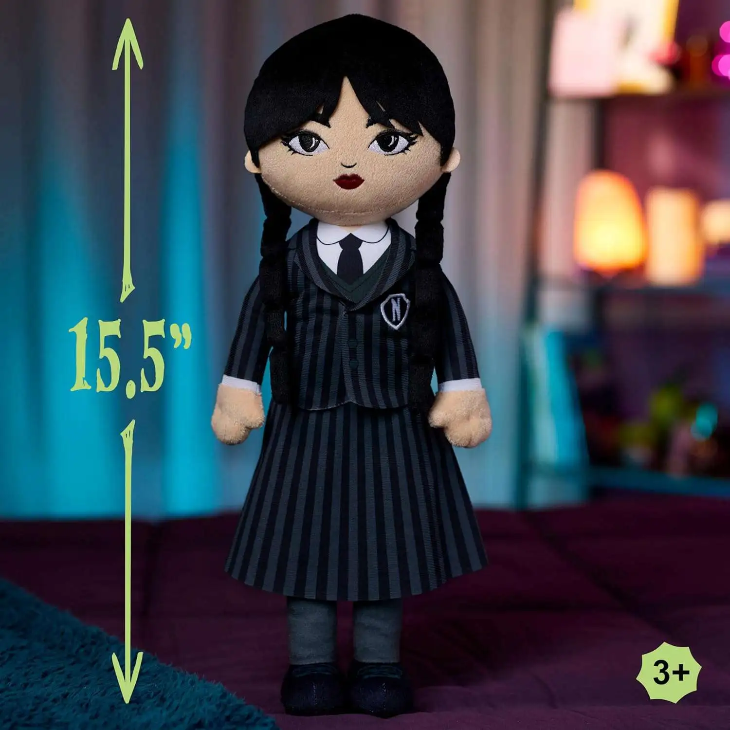 - Ideal for kids' beds, dorm rooms, or as a stoic sidekick for sleepovers and travel, this 15.5-inch Wednesday plush doll is guaranteed to coax a grin from even the gloomiest soul.