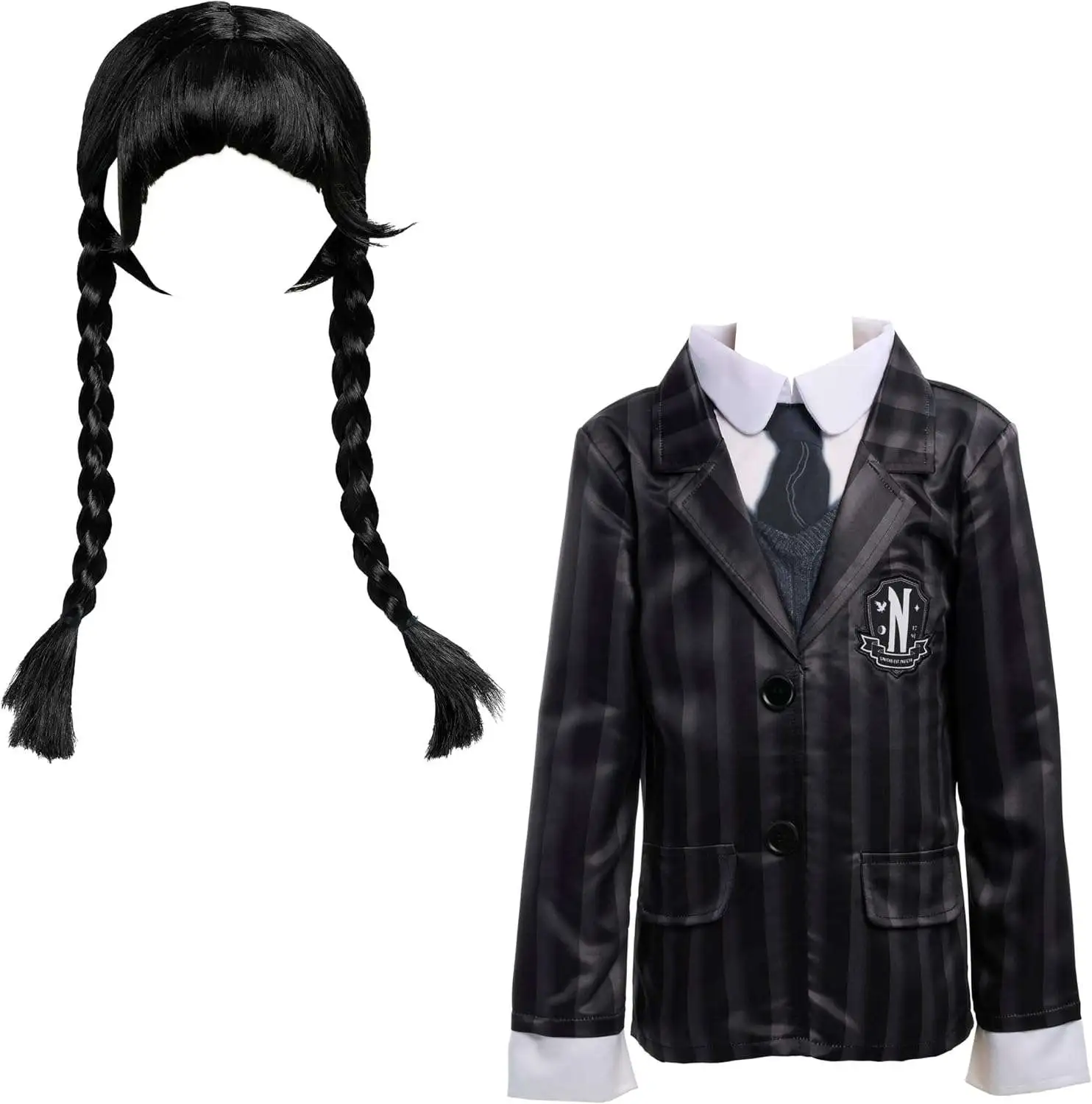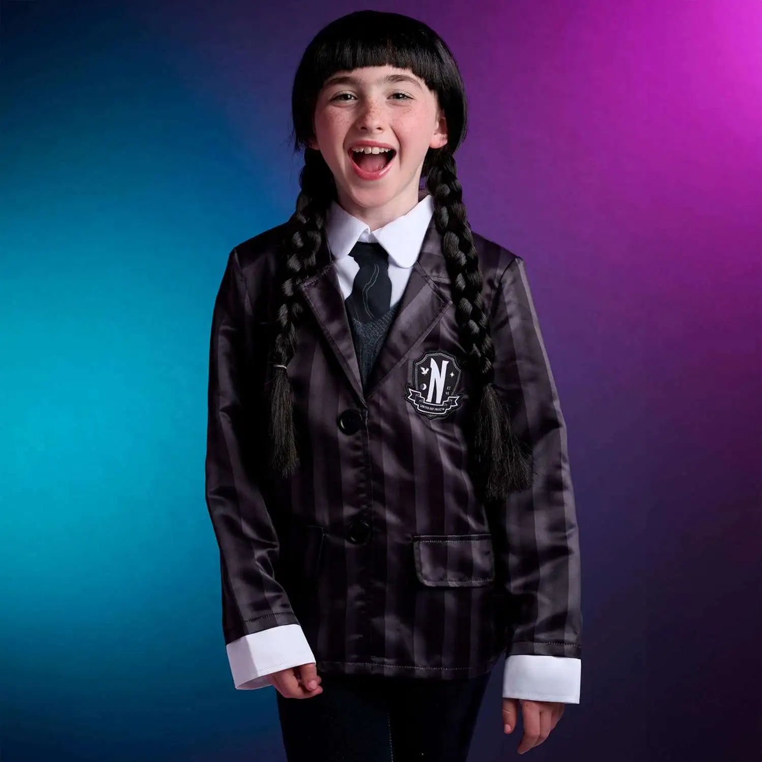 - Kids will love to dress up and pretend play Wednesday Addams with this Wednesday wig and Nevermore Academy uniform jacket role-play set inspired by the hit TV series, Wednesday.