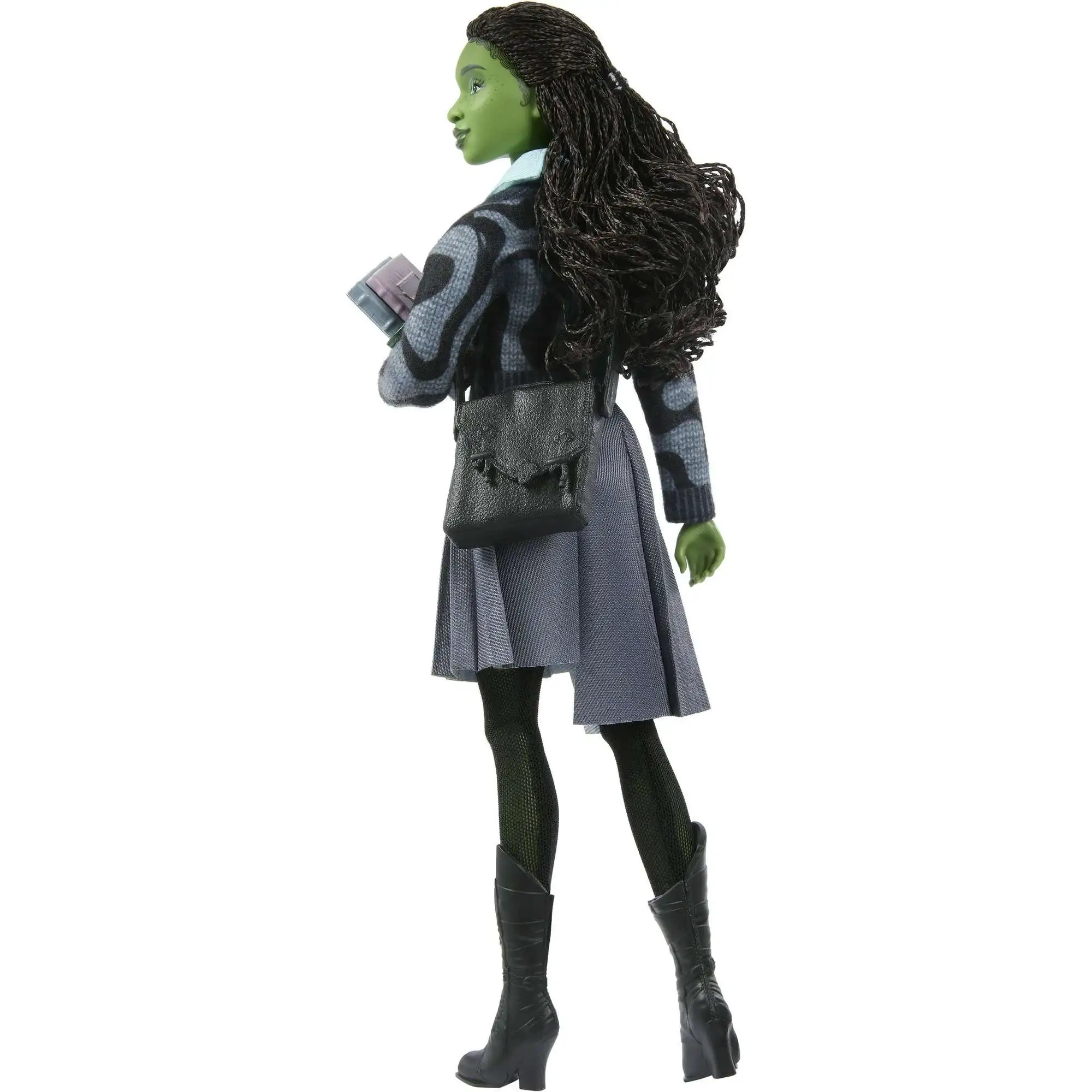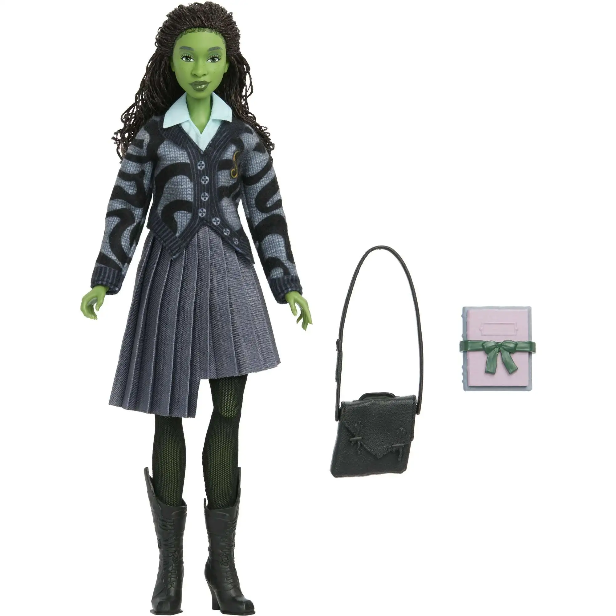 - Inspired by Universal Pictures' Wicked, Elphaba doll wears her removable school uniform, like her button up cardigan, asymmetrical skirt, leggings, and boots.